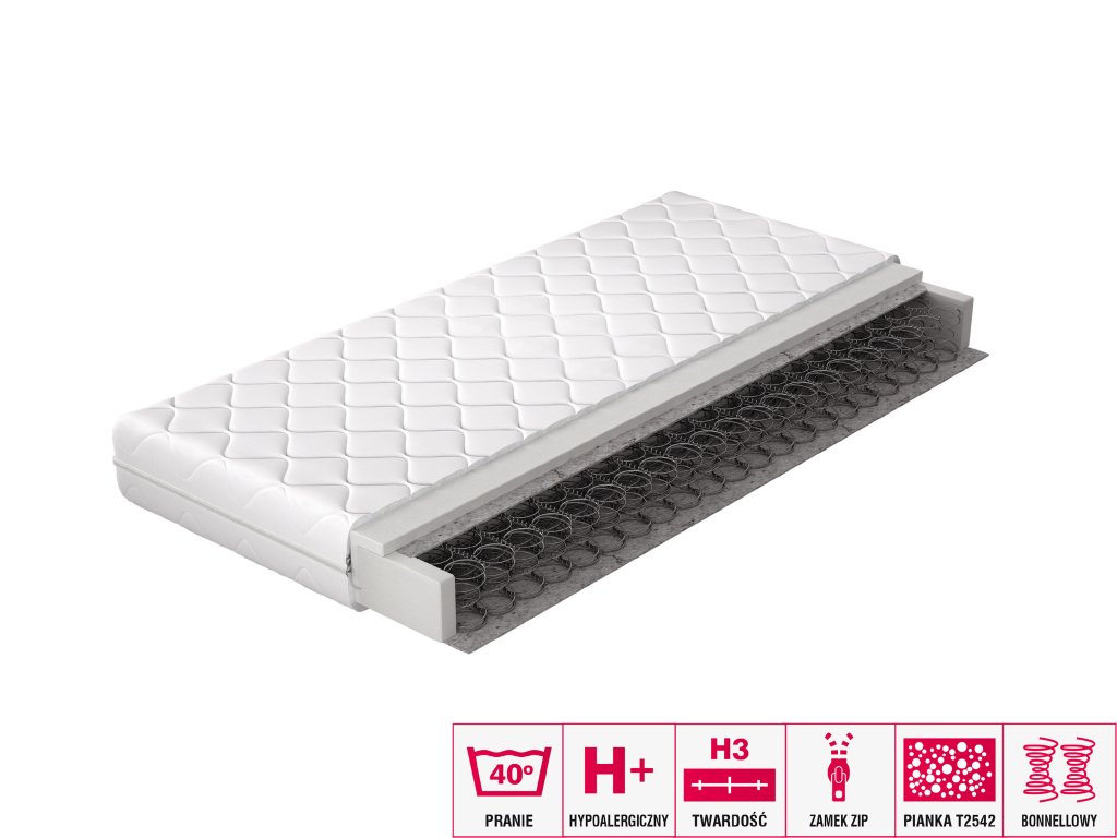 Zárukou dobrého spánku je perfektně vybraná matrace. Víme, jak důležité je toto rozhodnutí, a proto vám představujeme bonellovou matraci OMINI. Bonellová pružina zajišťuje, že se matrace nedeformuje během používání, což je klíčové pro kvalitní spánek. Je překryta filcovou podložkou, na kterou byla nanesena pěna T2542. To vše je uzavřeno ve snímatelném potahu.Doplňkové parametry