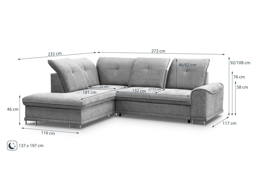 Souprava je vybavena rozkládacím systémem DELFÍN, díky kterému snadno vytvoříte lůžko o rozměru 137 × 197 cm. Praktický úložný prostor poslouží pro uložení lůžkovin či dek.
