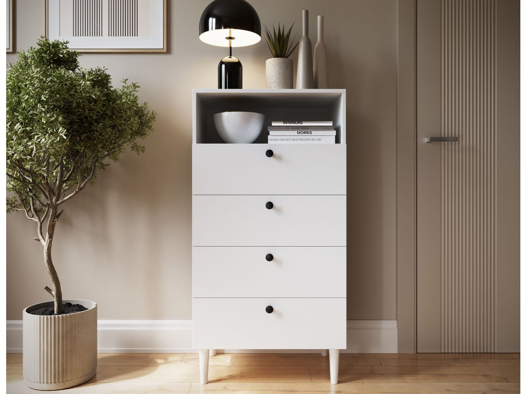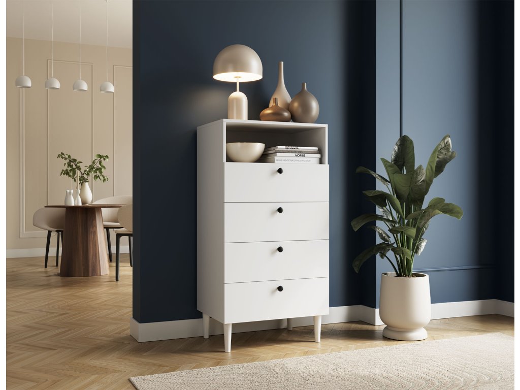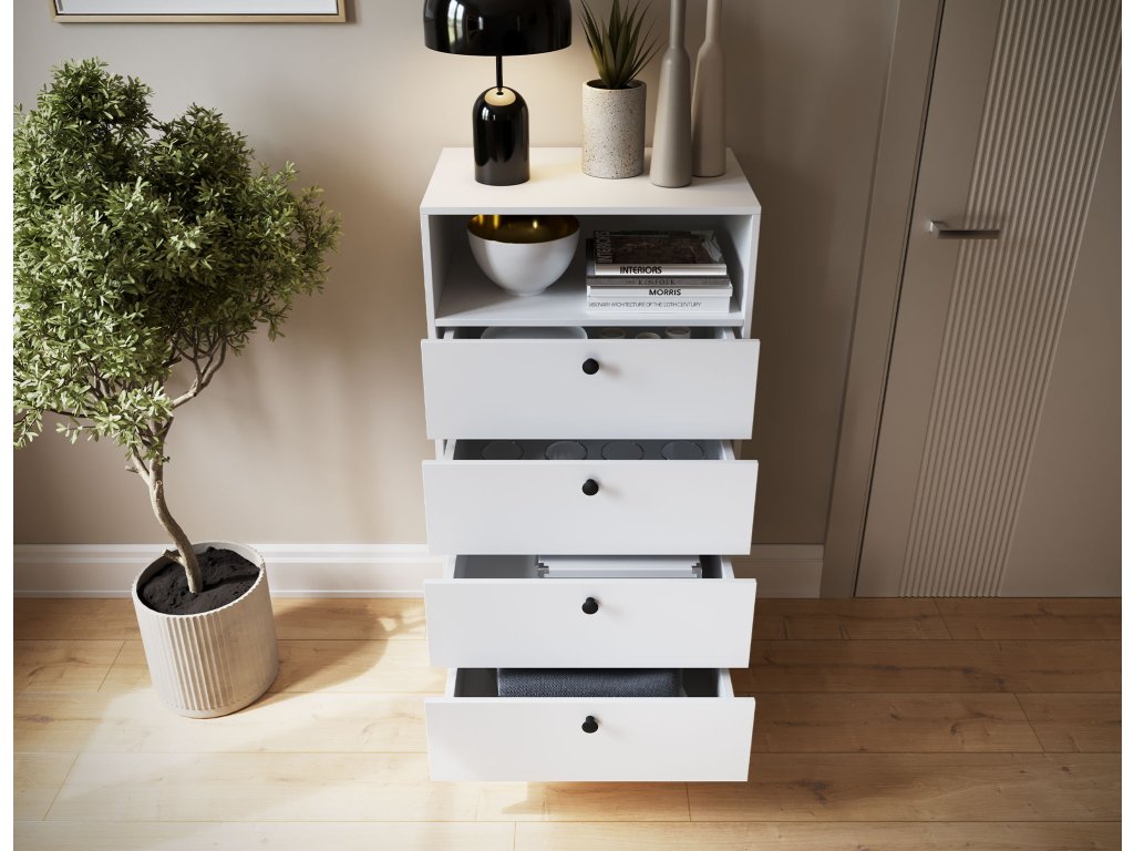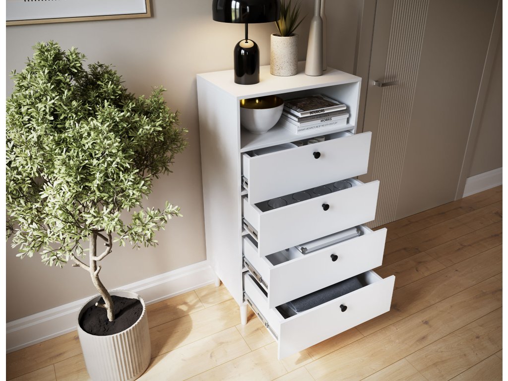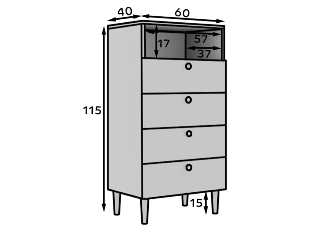 Regál Dullum je stylový a praktický kus nábytku o rozměrech 40 cm hloubka, 60 cm šířka a 115 cm výška. Je vybaven jednou otevřenou policí a čtyřmi zásuvkami, které umožňují ukládání různých věcí. Regál stojí na dřevěných nohách o výšce 15 cm, což mu dodává lehkost a eleganci. Maximální zatížení každé zásuvky je 3 kg, což činí nábytek funkčním, zároveň však pevný a stabilní.Doplňkové parametry