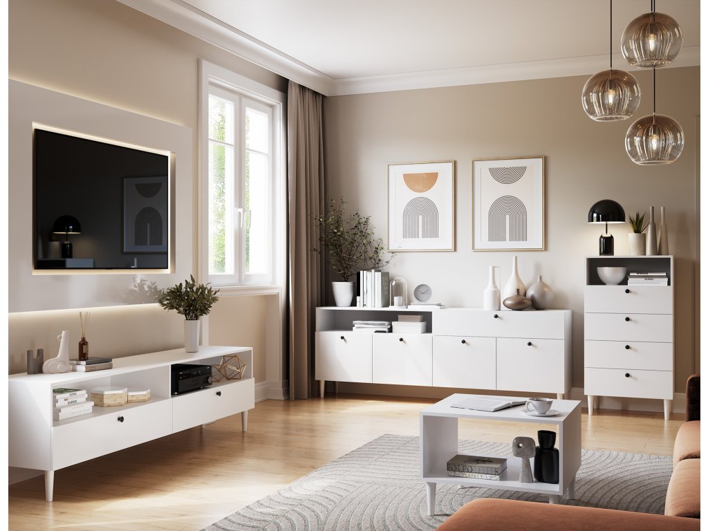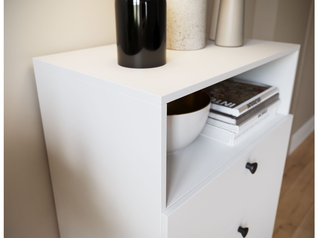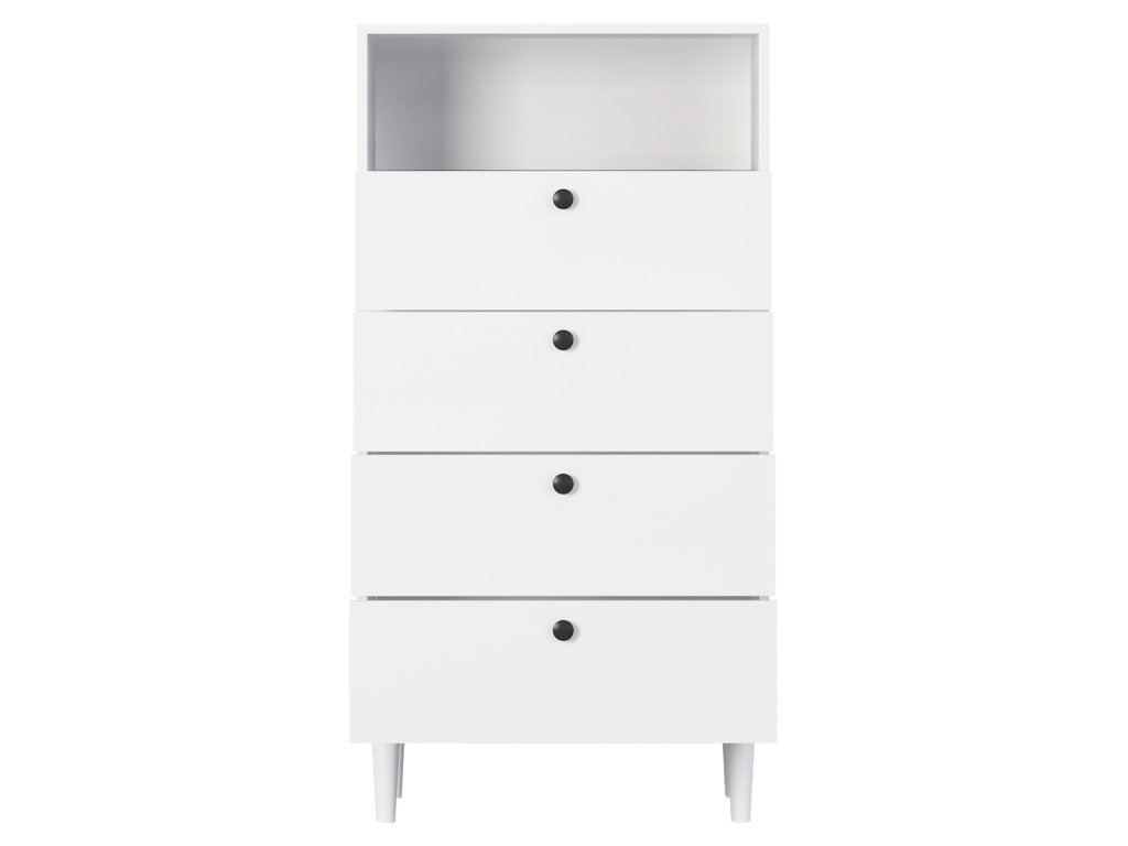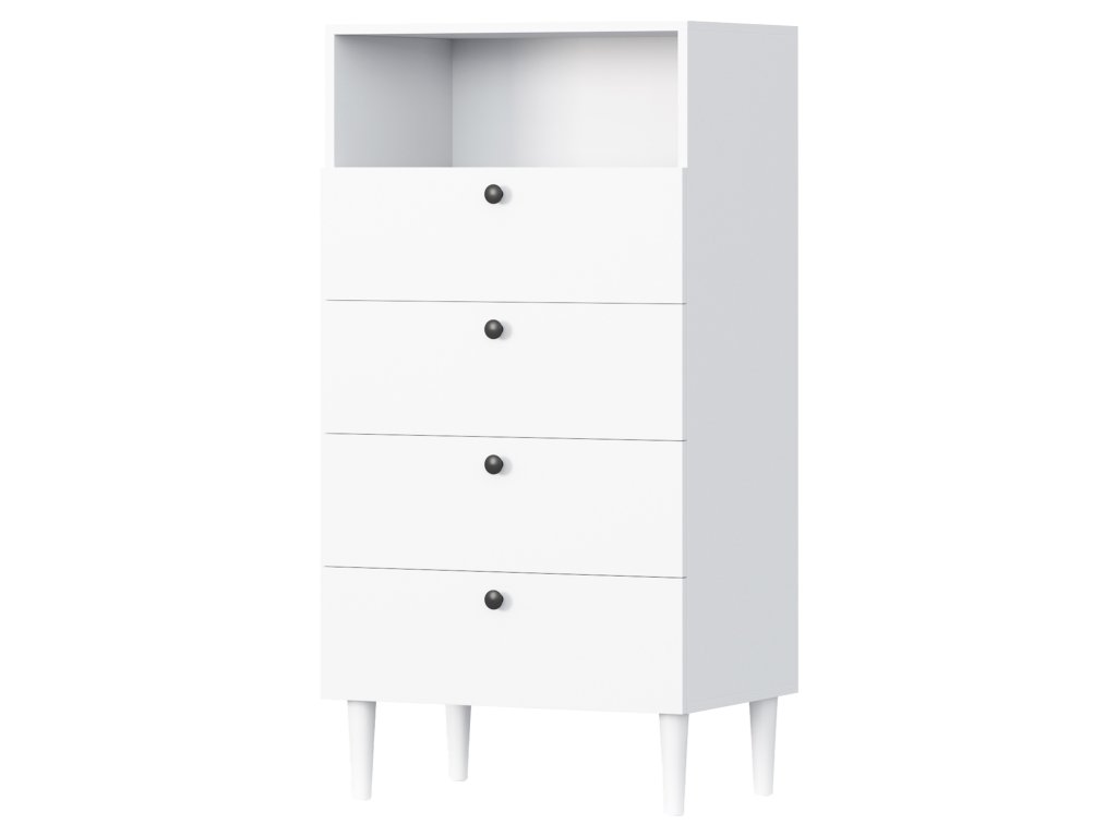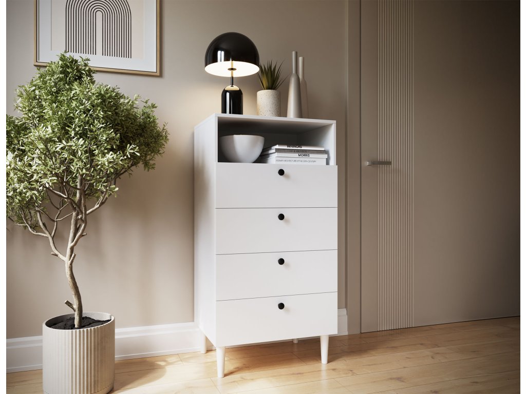 Regál Dullum je stylový a praktický kus nábytku o rozměrech 40 cm hloubka, 60 cm šířka a 115 cm výška. Je vybaven jednou otevřenou policí a čtyřmi zásuvkami, které umožňují ukládání různých věcí. Regál stojí na dřevěných nohách o výšce 15 cm, což mu dodává lehkost a eleganci. Maximální zatížení každé zásuvky je 3 kg, což činí nábytek funkčním, zároveň však pevný a stabilní.Doplňkové parametry