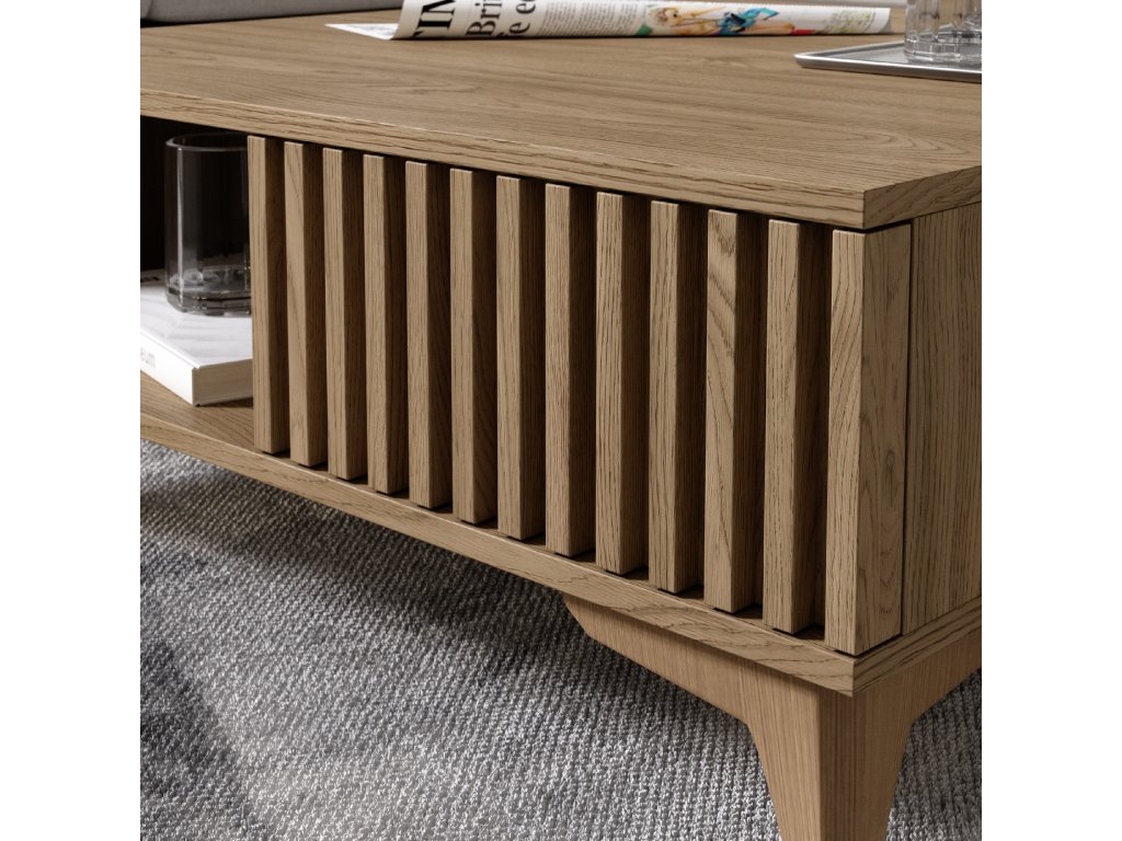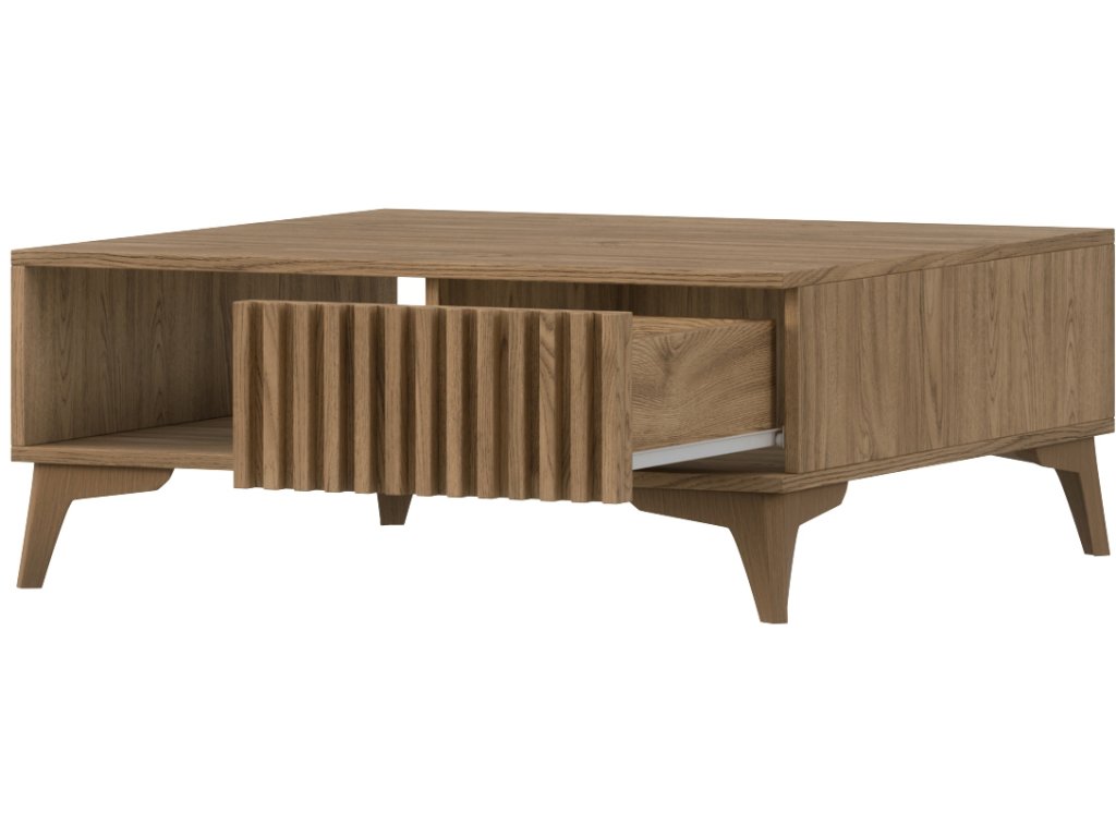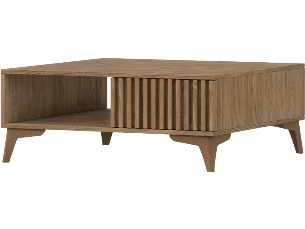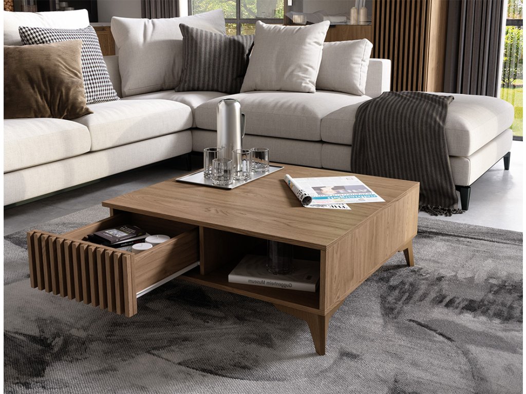 Konferenční stolek Entsian je elegantní a funkční doplněk do vašeho obývacího pokoje. Navržený s ohledem na praktičnost a estetiku, tento stolek nabízí spoustu místa na uložení a prezentaci vašich oblíbených předmětů. S hloubkou 80 cm a šířkou 80 cm má tento konferenční stolek ideální proporce, které se hodí do většiny prostorů. Jeho nízká výška 32 cm mu dodává moderní vzhled a zajišťuje pohodlí při používání během konzumace nápojů nebo sledování televize. Konferenční stolek Entsian má pevné nožičky o výšce 12 cm, vyrobené z odolného plastu. Díky nim je stolek stabilní a pevně stojí na podlaze, přidávající eleganci a styl do vašeho interiéru. Stolek je vyroben z odolné desky o tloušťce 16 mm, což zaručuje trvanlivost a pevnost konstrukce. Jeho povrch je pečlivě upraven a hrany zásuvek jsou pokryty odolným materiálem ABS, což přidává výjimečný charakter a ochranu před poškozením. Konferenční stolek Entsian má praktickou zásuvku s frézovanými čely, kde můžete ukládat drobnosti a udržovat pořádek v obývacím pokoji. Navíc obsahuje otevřenou polici, která je skvělým místem pro vystavení dekorací, knih nebo časopisů. Tento konferenční stolek je kombinací funkčnosti, pevnosti a stylového designu. Díky svým rozměrům a praktickým řešením se ideálně hodí do každého interiéru, přidávající mu výjimečný charakter a eleganci.