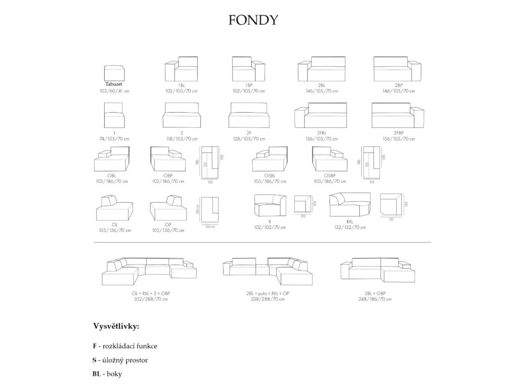 Dominantní rozměry a pocit absolutní svobody – to je rohová sestava Fondy o šířce 338 cm. Tento model byl stvořen pro prostorné obývací pokoje, kde se stane přirozeným centrem všeho dění. Díky velkorysé hloubce sedu a přiloženému taburetu nabízí tato sestava nadstandardní plochu pro odpočinek, na kterou se pohodlně usadí celá rodina i skupina přátel, aniž by kdokoli musel slevovat ze svého pohodlí.