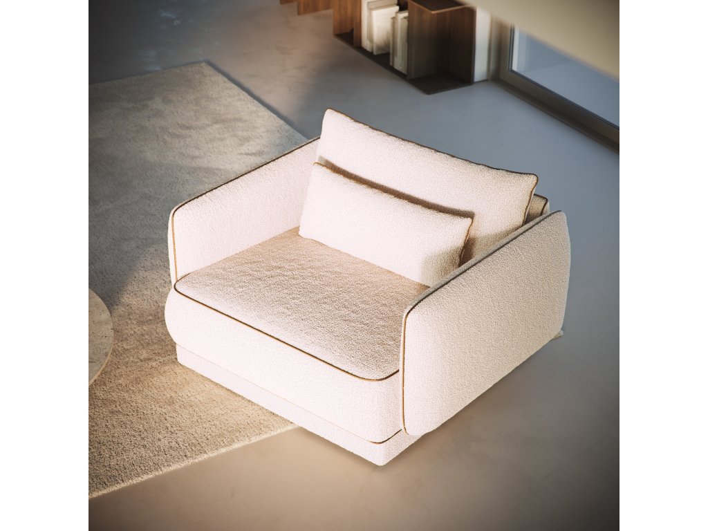 - Okraje sedáků a polštářů jsou zpevněny lemem (kedrou) z kvalitní veganské kůže. Tento prvek není jen estetickým doplňkem, ale slouží i jako funkční ochrana nejvíce namáhaných hran. Veganská kůže je odolná vůči otěru a snadno se udržuje, což zaručuje, že si křeslo zachová své precizní linie i při každodenním rodinném provozu.