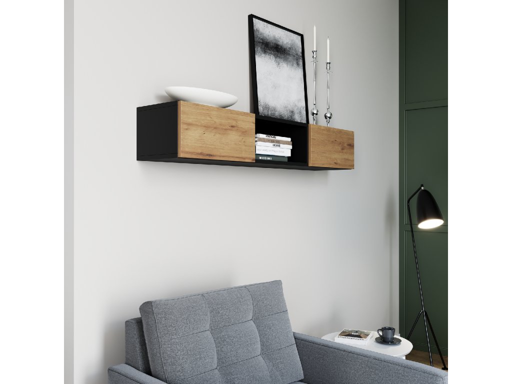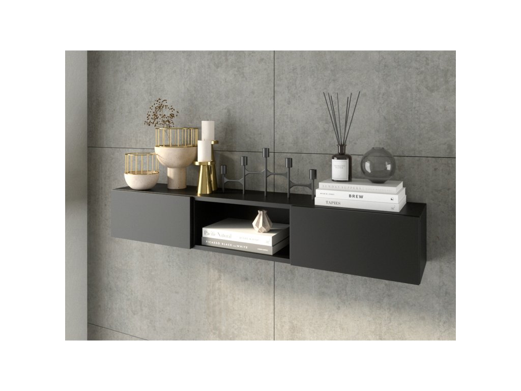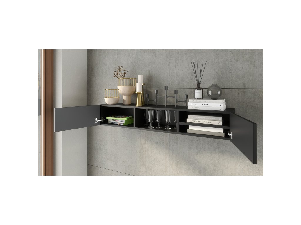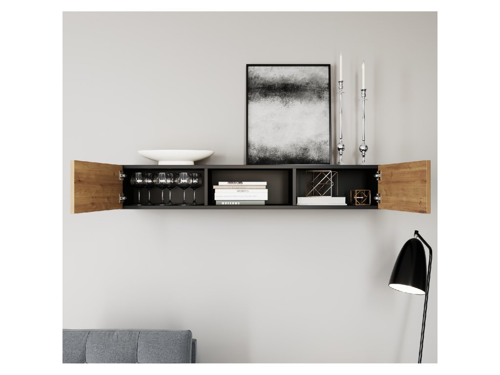 Závěsná police Lanzzi je praktickým a zároveň stylovým kusem nábytku. V jejím středu se nachází otevřený výklenek s policí pro vystavení dekorací, knih nebo drobností. Po stranách jsou umístěny dvě skříňky s dvířky, které se otevírají pomocí funkce push to open a umožňují uložit vše, co má zůstat skryto.