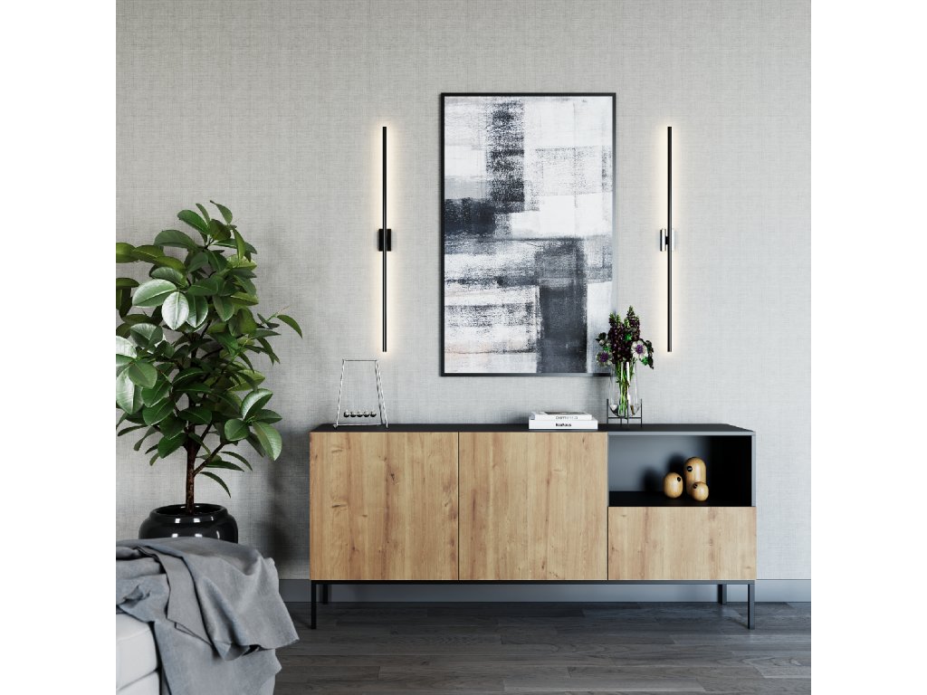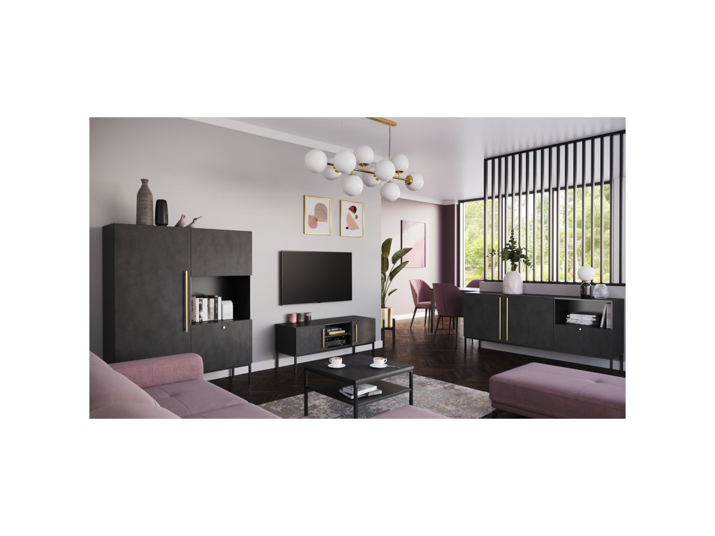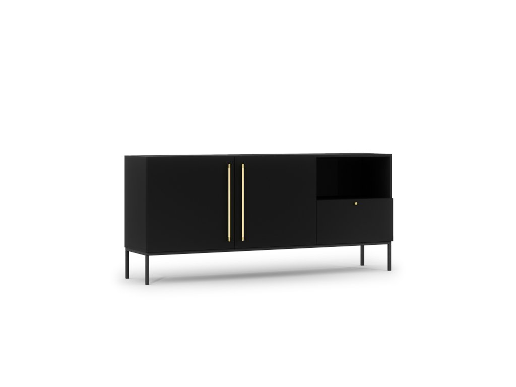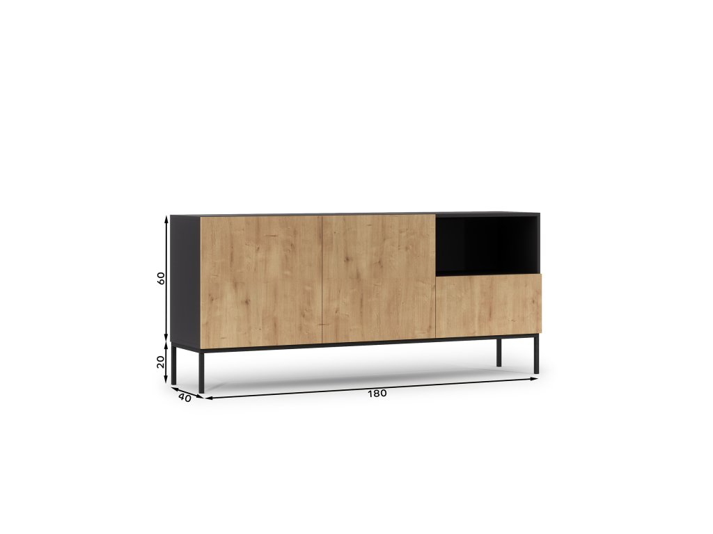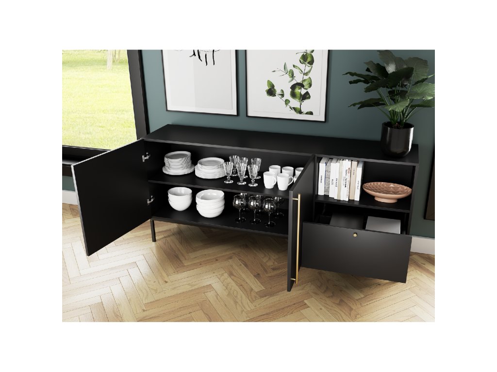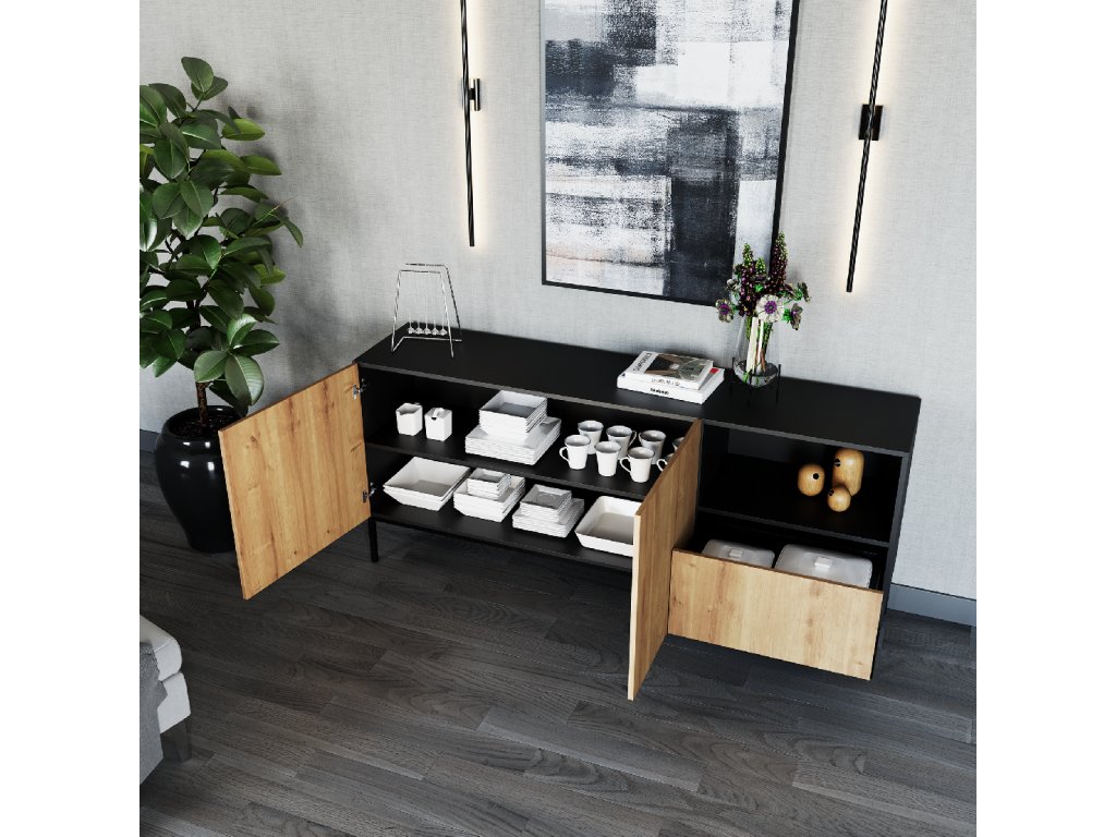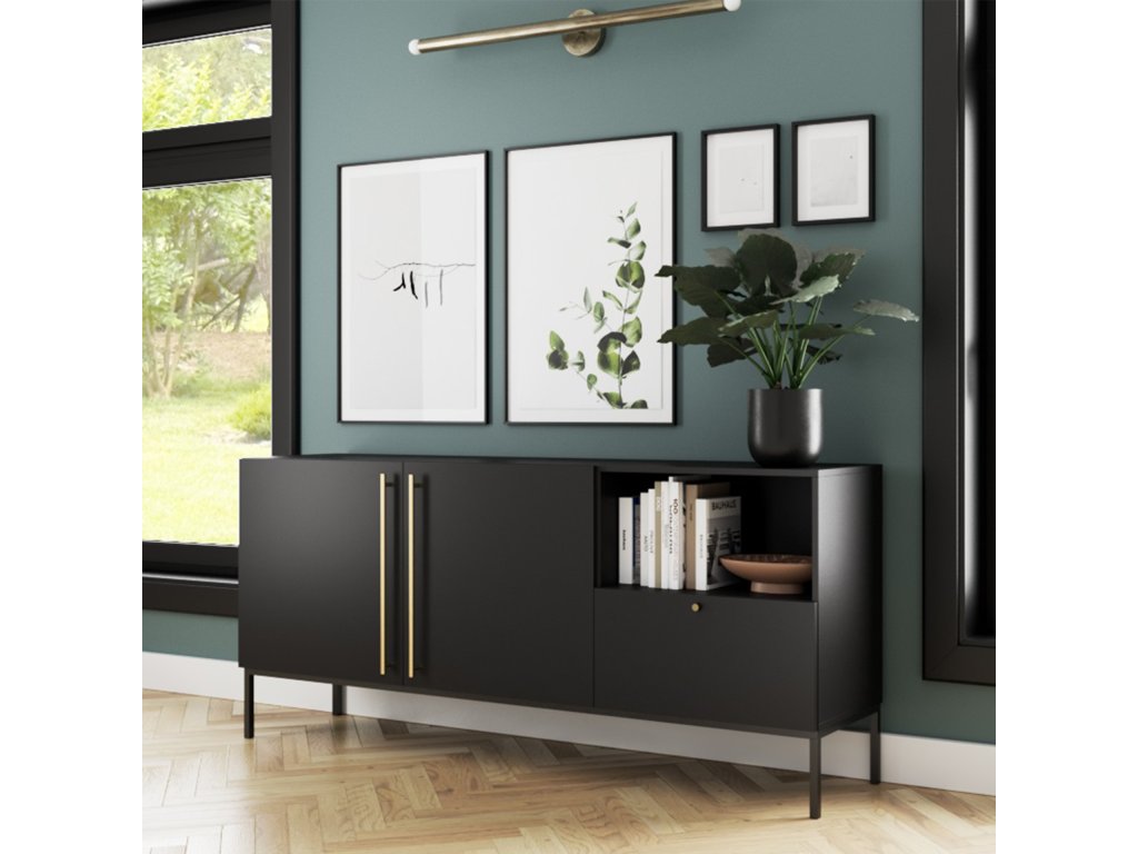Velká komoda Lanzzi s jedNeu velkorysou zásuvkou má čistou siluetu a neutrální, jedNelitý povrch, který se hodí téměř do každé barevné palety. Zásuvka se hladce otevírá a je téměř tichá díky funkci měkkého dovírání. V komodě jsou navíc dvě velké police, které jsou ukryty za dvojicí uzamykatelných dveří. Třetí police není krytá, což vám dává možNest vystavit například fotografie nebo svíčky. Téměř dva metry široká komoda Lanzzi vám umožní skrýt velké mNežství náhradního ložního prádla, košil, kalhot a dalších potřebných kusů oblečení. Matné barvy nábytku vznikly v následujících konfiguracích: Matná černá v kombinaci s řemeslným dubem a pouze Matná černá. To vám dává možNest vybrat si z oblíbené černé barvy a dřeva spojeného s přírodou. Doplňkem k černé variantě jsou zlaté rukojeti. Druhá verze se otevírá pomocí pantů "push to open", které stačí jen lehce stiskNeut, abyste mohli používat police nebo zásuvku v komodě Lenzzi. Černé, kovové, 20centimetrové Nehy dodávají nábytku pocit stability a zároveň jsou zajímavým doplňkem. K dispozici ve dvou barváchVýška: 80 cm Hloubka: 40 cm Šířka: 180 cm HmotNest: 51 kg Materiálové provedení: Matná černá+Řemeslný dub / Matná černá+czatny mat Barva rámu: Matná černáeriální: MDF Nehy: kovové Výška Nehou: 20 cm Počet zásuvek: 1 Počet dveří: 2 Počet zavřených polic: 2 Počet otevřených polic: 1Doplňkové parametry