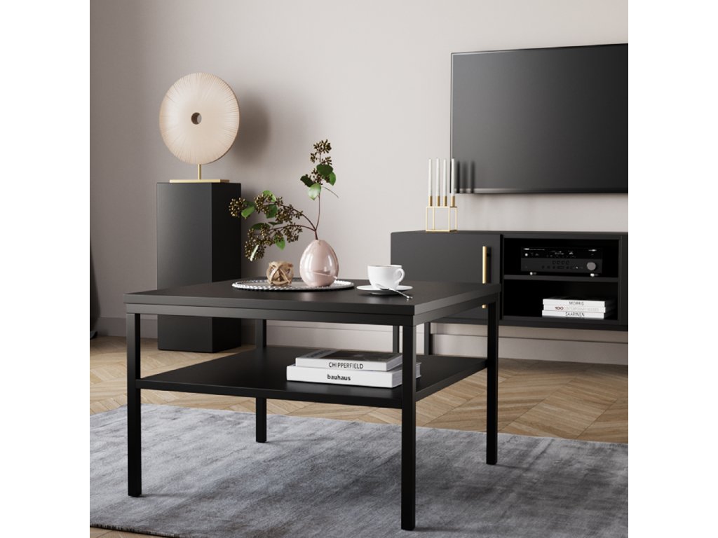 Čtvercové horní i dolní patro stolku Lanzzi je vyrobeno z MDF desky potažené laminátem, který poskytuje snadno čistitelný povrch, vhodný pro odložení občerstvení či nápojů. Na spodní polici lze uložit časopisy, dálkové ovladače nebo drobnosti.