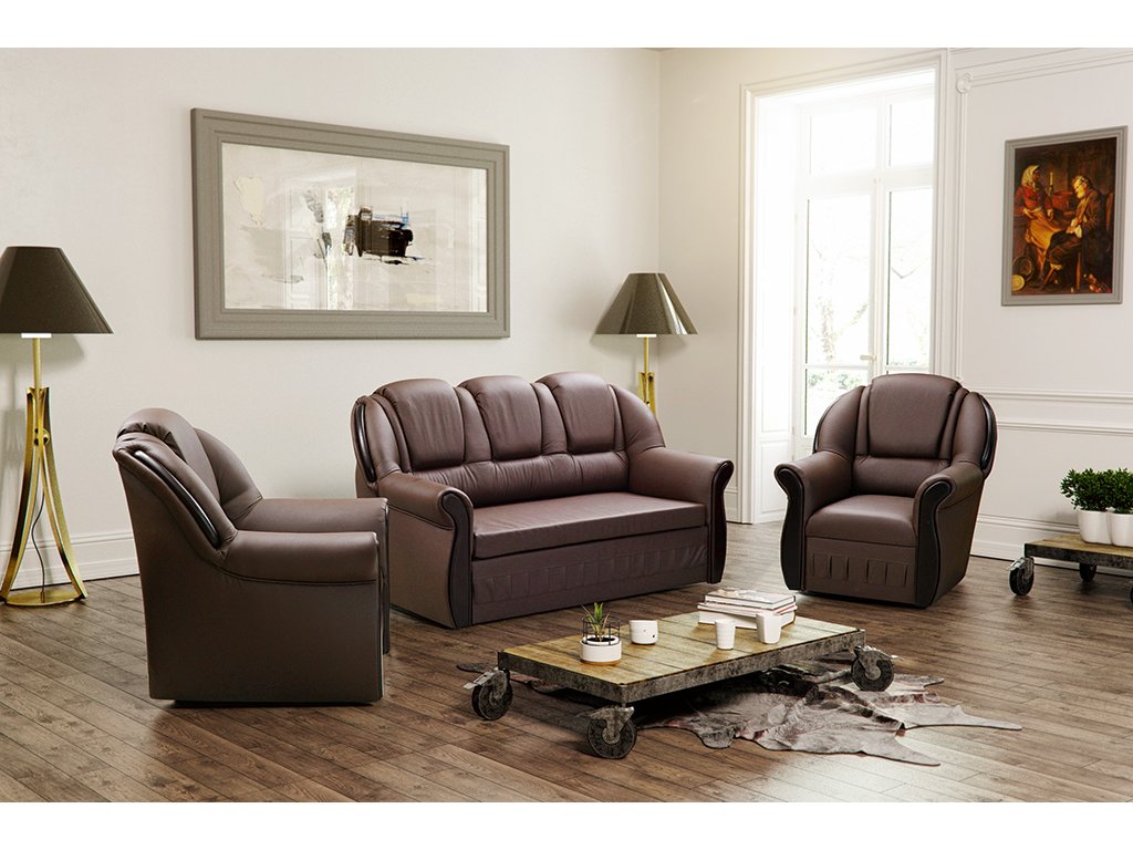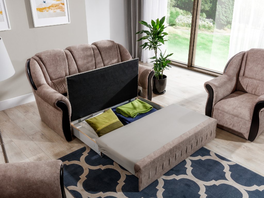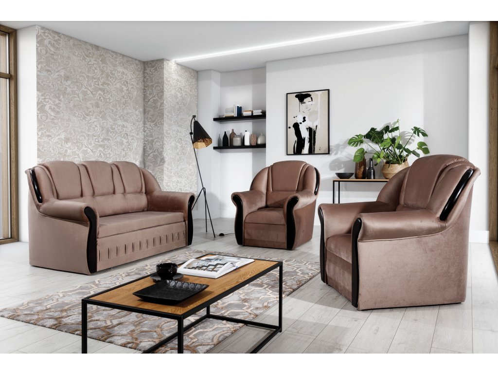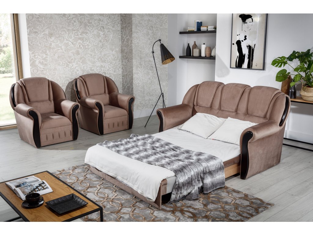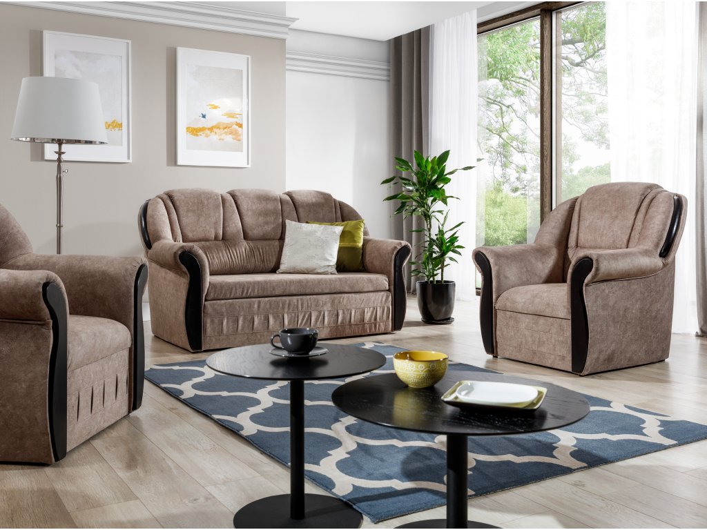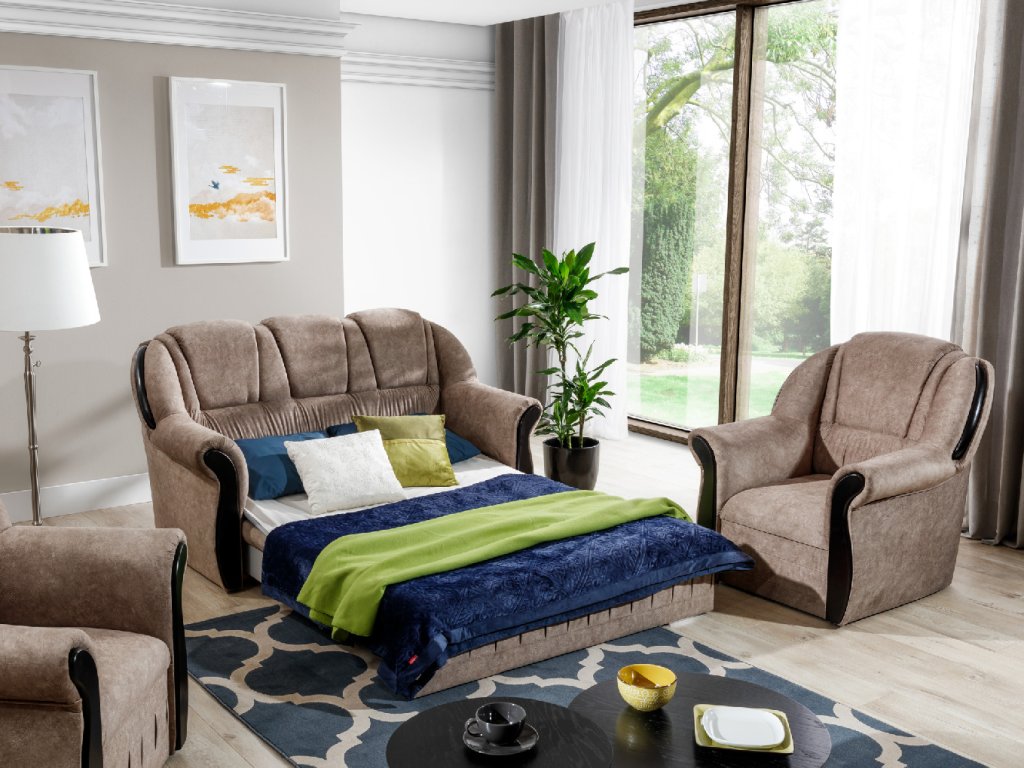 Sedací souprava Lord, která se skládá z pohovky a dvou křesel, je ztělesněním klasiky kombinované s opravdovou elegancí. Nábytek z této sestavy se vyznačuje nejen výjimečným pohodlím, ale také sofistikovaným designem. Pohovka i křesla mají měkká sedadla vyplněná elastickou, zatížení odolnou a proti deformacím rezistentní pěnou T30. Navíc je naše pohovka ideální jak pro denní odpočinek, tak i pro noční spaní – je totiž vybavena rozkládací funkcí a prostorným, praktickým úložným prostorem na lůžkoviny. Rozměry pohovky jsou 180 x 108 x 105 cm, křesla pak 80 x 108 x 105 cm, takže se perfektně hodí i do menších obývacích pokojů. Po rozložení získáte pohodlnou plochu ke spaní o rozměrech 185 x 135 cm. Díky jednoduché, stabilní konstrukci je rozložení pohovky snadné a intuitivní. Nelze opomenout ani křesla, jejichž přednostmi jsou hluboké sedáky, vysoká opěradla a ergonomicky tvarované područky. Celý komplet je zdoben dřevěnými prvky a stylovým prošíváním, které imituje elegantní zvrásnění a dekorační prohlubně. Lord se skvěle kombinuje například s dřevěným nábytkem nebo starožitnostmi. Vyznačuje se zvláštní péčí o detaily, výjimečnými dekorativními prvky a kvalitními materiály. Doporučujeme věnovat pozornost naší sedací soupravě Lord, která s lehkostí promění jakýkoli interiér.Doplňkové parametry