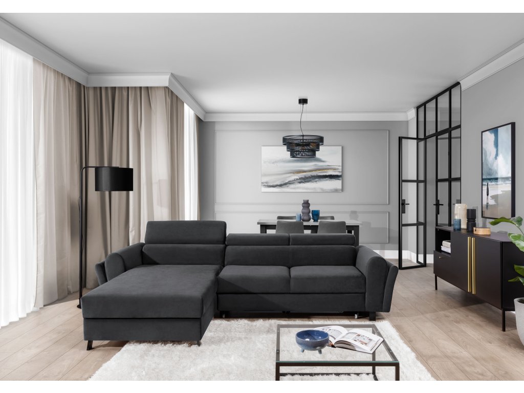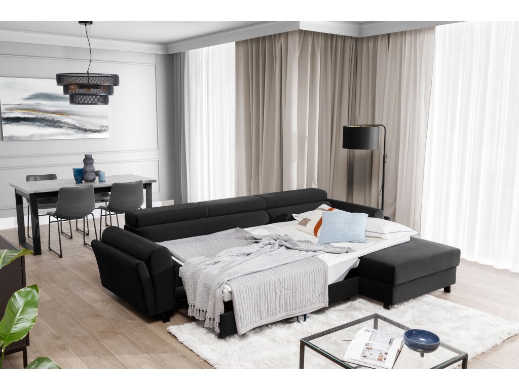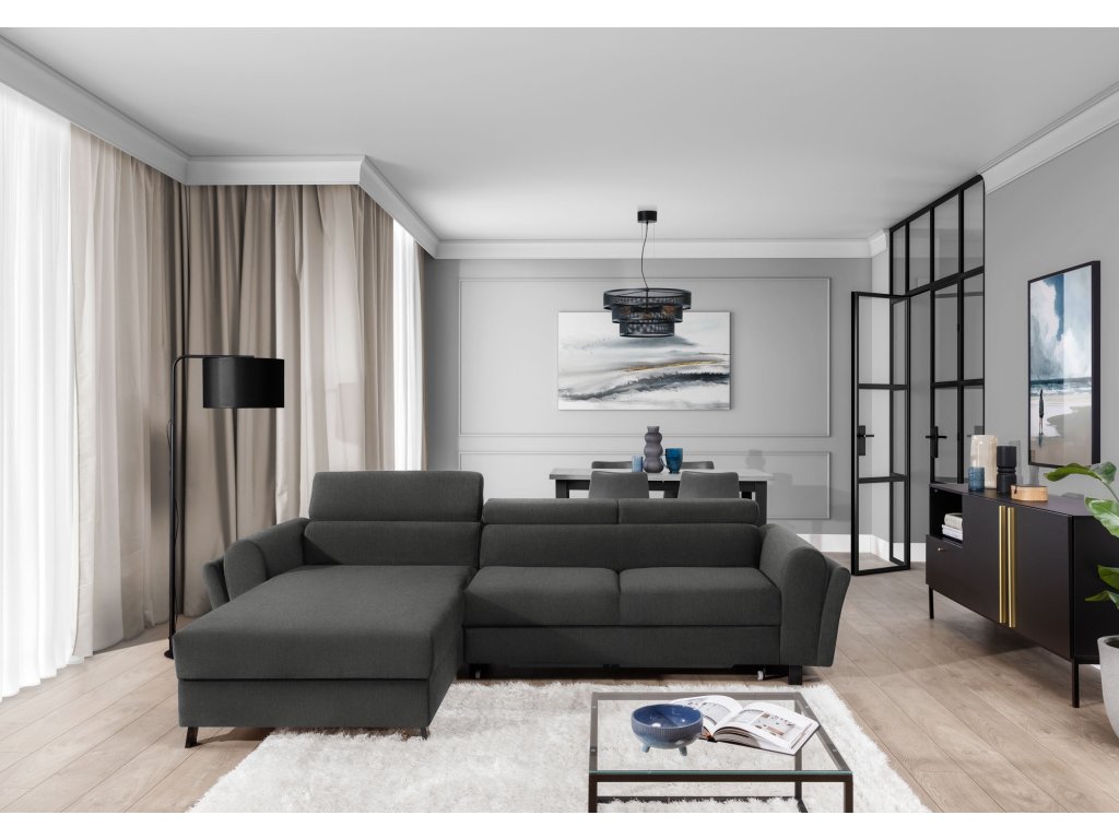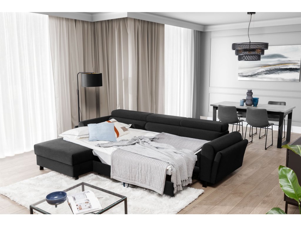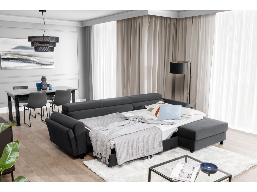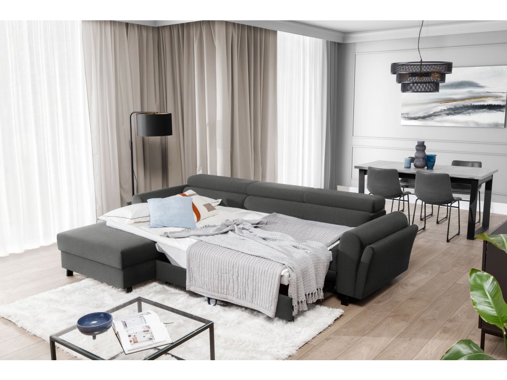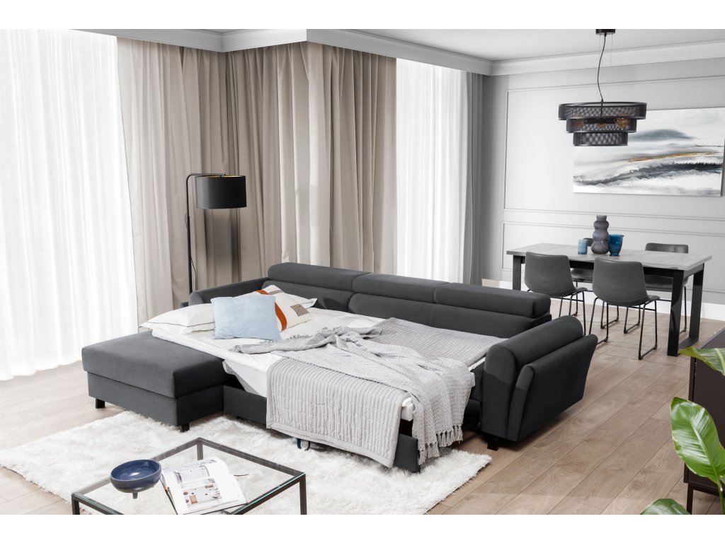 Mariall je klasická, zároveň pohodlná a elegantní rohová sedací souprava ve tvaru písmene L o rozměrech 300 x 190 x 98 cm. Mezi její charakteristické rysy patří: nastavitelné opěrky hlavy, čalouněná zadní část pohovky, elegantní kovové nožky s dřevěnými detaily a hluboký, měkký sedák vyrobený z inovativní pěny T30 a HR, která je odolná vůči deformacím a poškození. Tyto materiály zajišťují maximální komfort jak během denního odpočinku, tak i při spánku. Díky rozkládací funkci je Mariall multifunkčním kusem nábytku. Po rozložení pohovky pomocí intuitivního a jednoduchého mechanismu typu delfín získáme prostorné lůžko o rozměrech 110 x 240 cm a hluboký úložný prostor na ložní prádlo umístěný v otomanu. Pokud hledáte funkční a zároveň klasický a elegantní nábytek – volba může být jen jedna – s čistým svědomím doporučujeme rohovou soupravu Mariall, která je odpovědí na všechny otázky.Doplňkové parametry