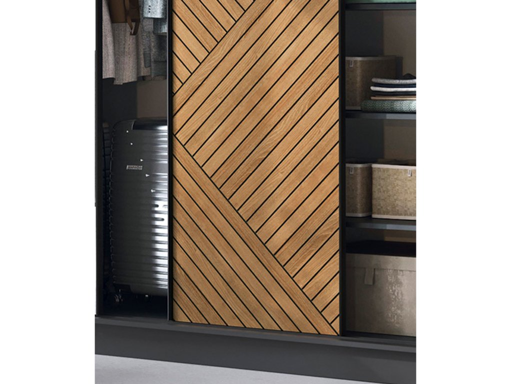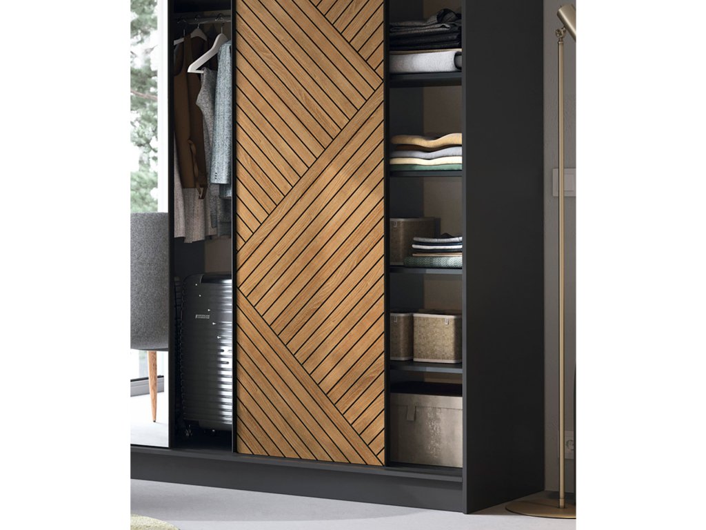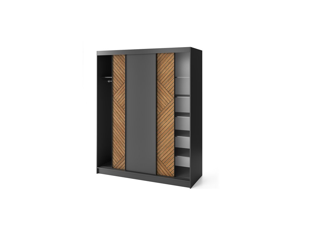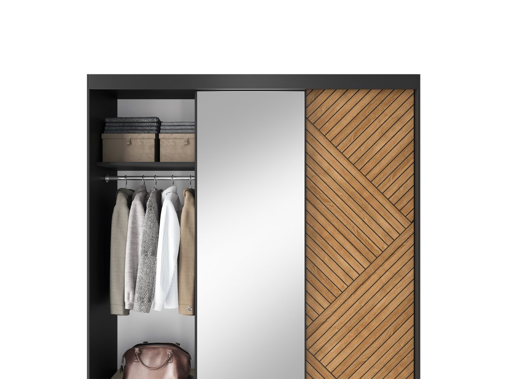 Skříň je vybavena třemi posuvnými dveřmi se zrcadlem, které opticky zvětšují místnost a zároveň šetří prostor při otevírání.