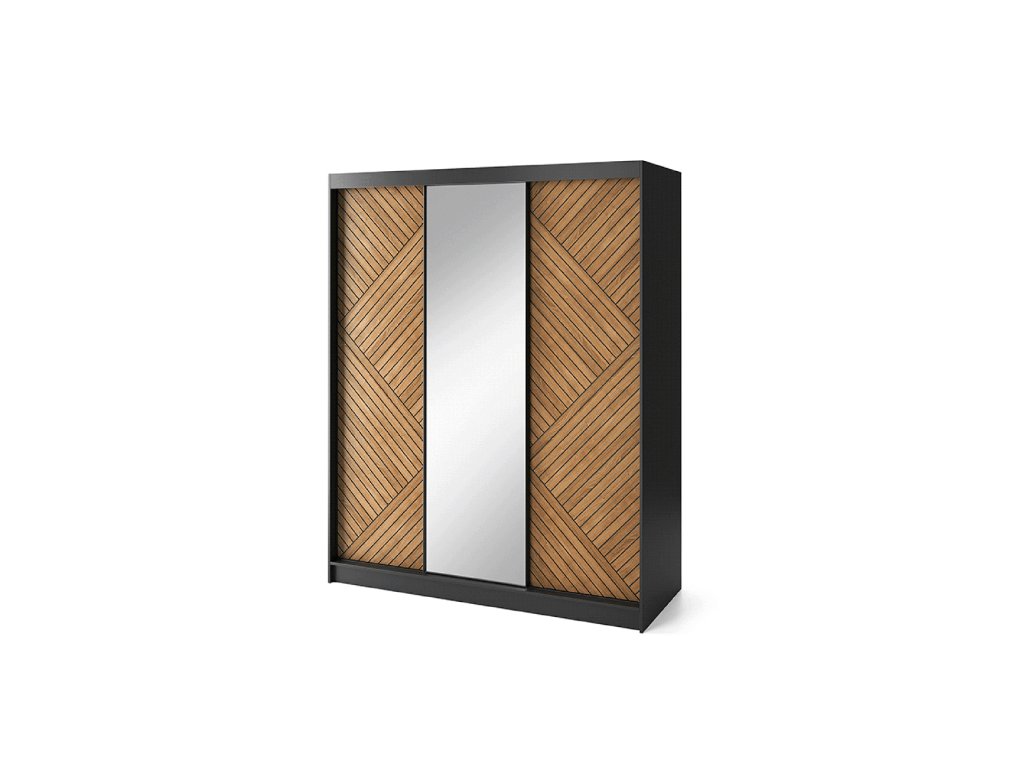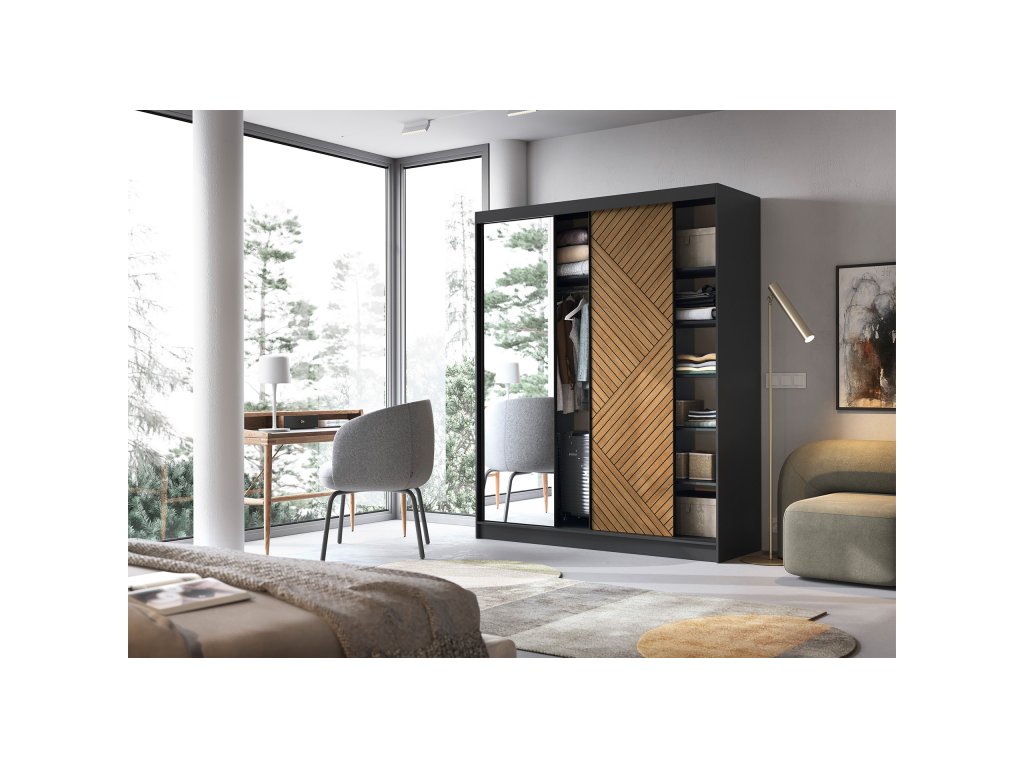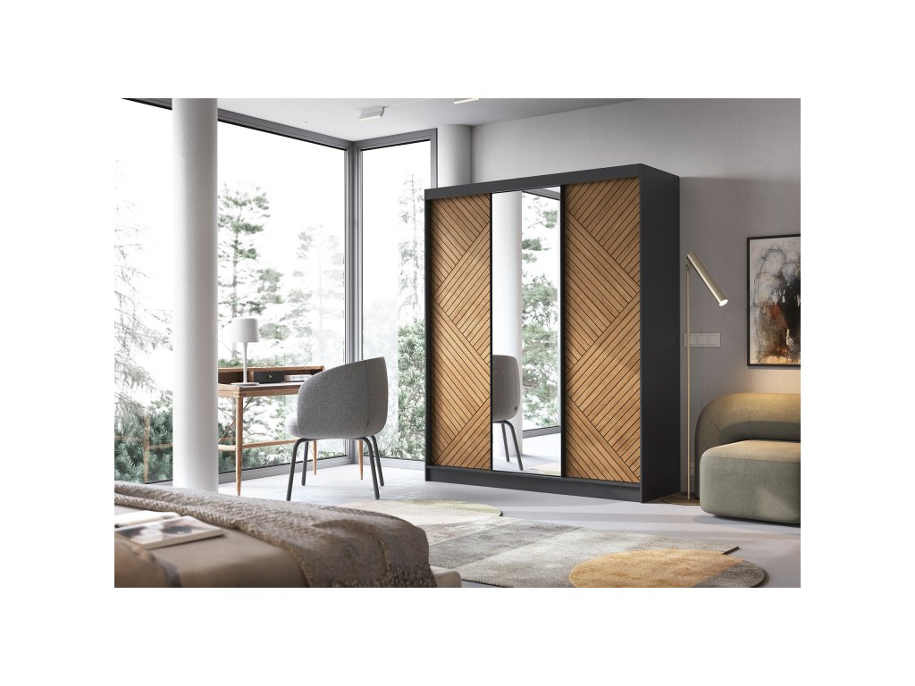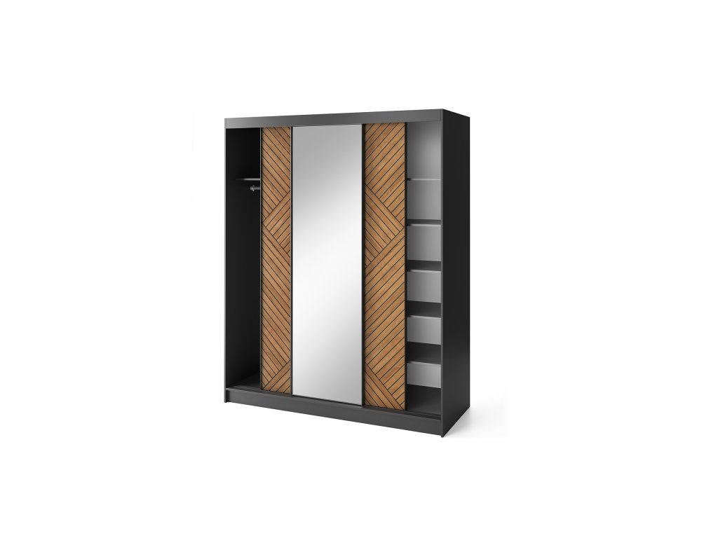 Skříň Marrphy se zrcadlem o rozměrech 60 cm hluboká, 180 cm široká a 220 cm vysoká představuje praktické a elegantní úložné řešení. Barevné provedení v odstínech karamelového dubu a černé dodává interiéru moderní a harmonický charakter.