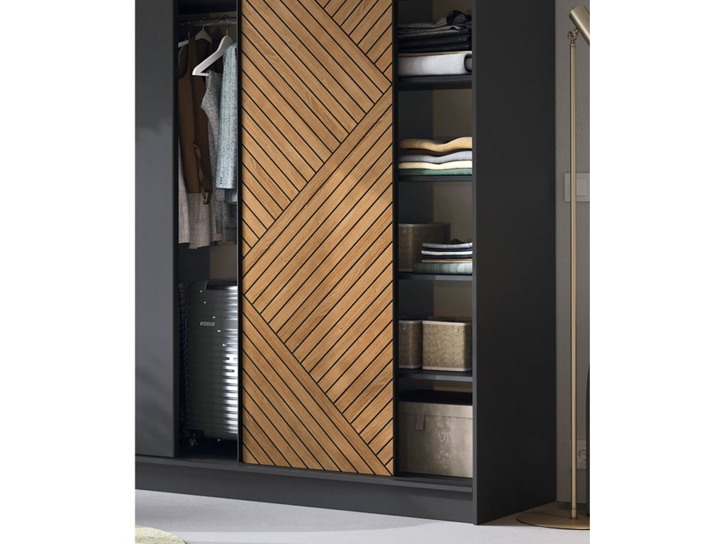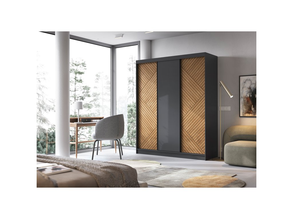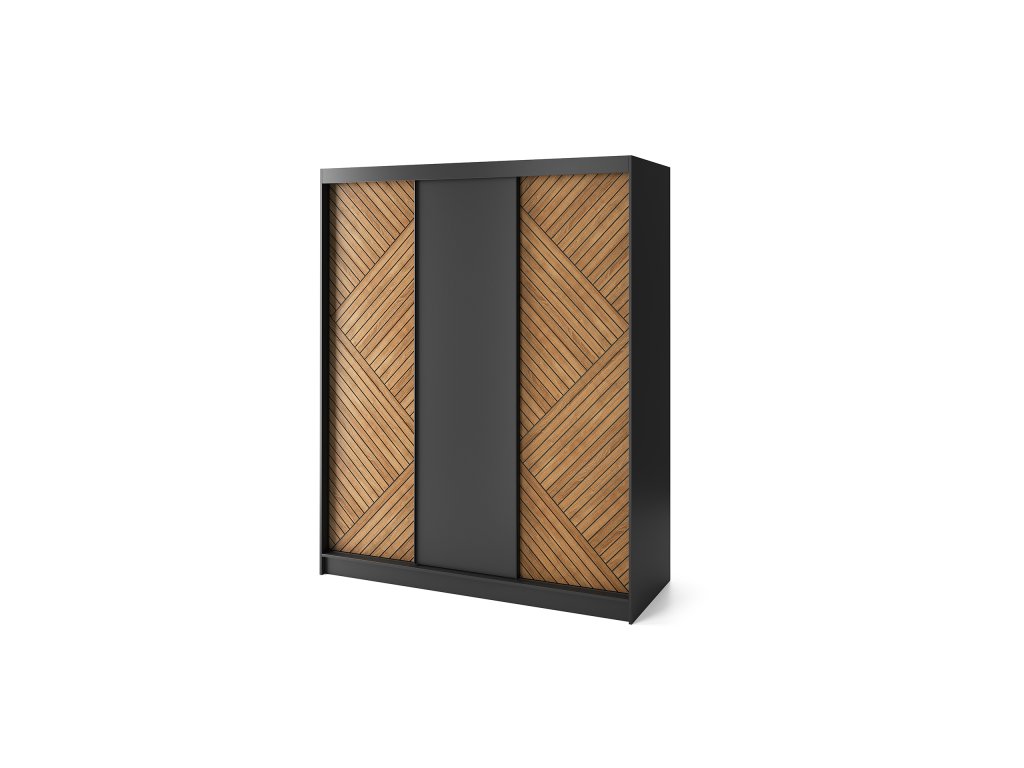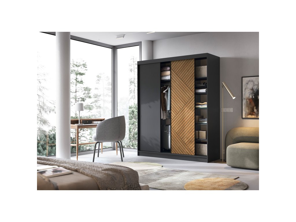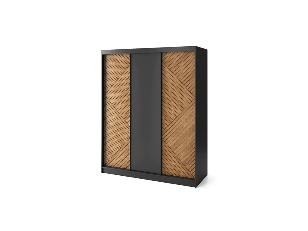 Skříň Marrphy se zrcadlem o rozměrech 60 cm hluboká, 180 cm široká a 220 cm vysoká představuje praktické a elegantní úložné řešení. Barevné provedení v odstínech karamelového dubu a černé dodává interiéru moderní a harmonický charakter.