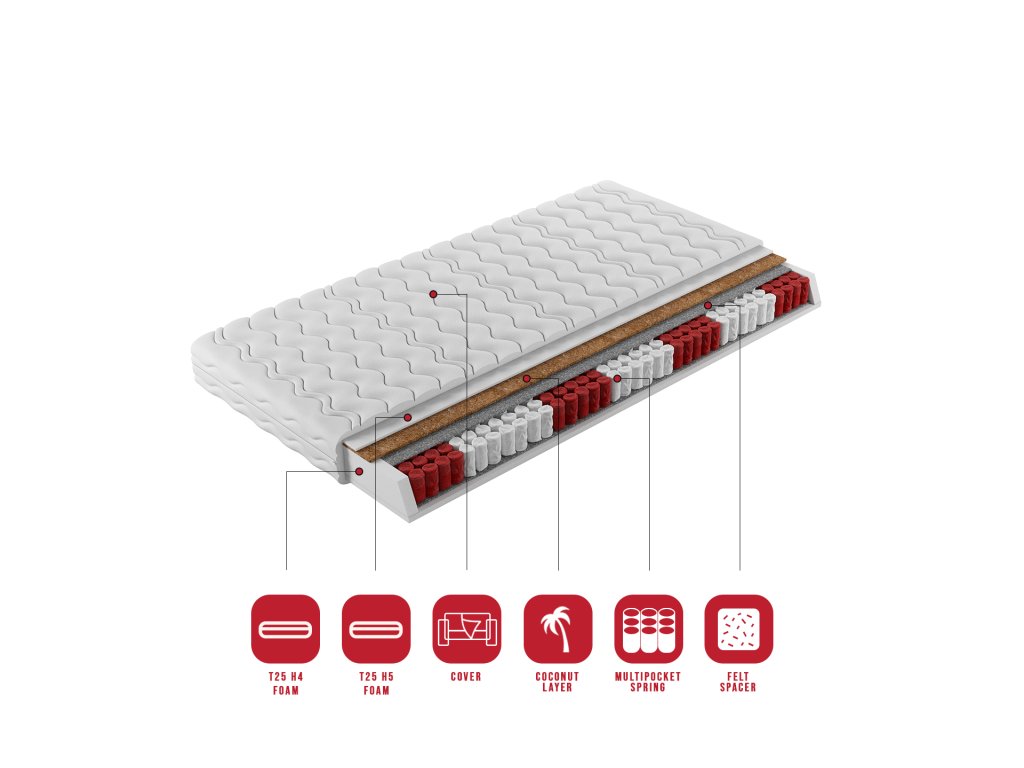 | Materiál: | Pěna T25; pružina Multipocket; plstěná podložka; kokosová deska |