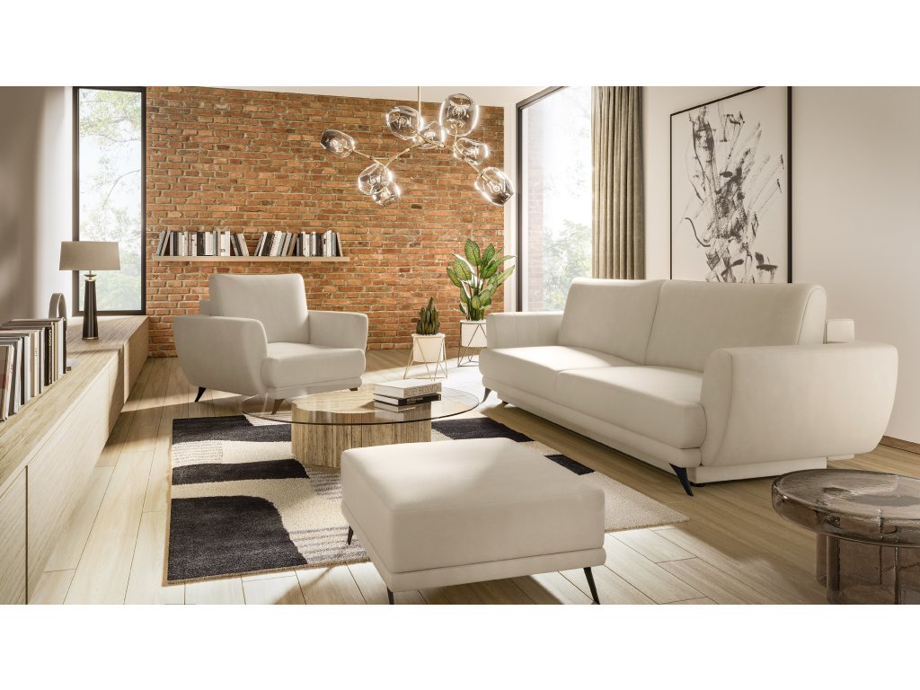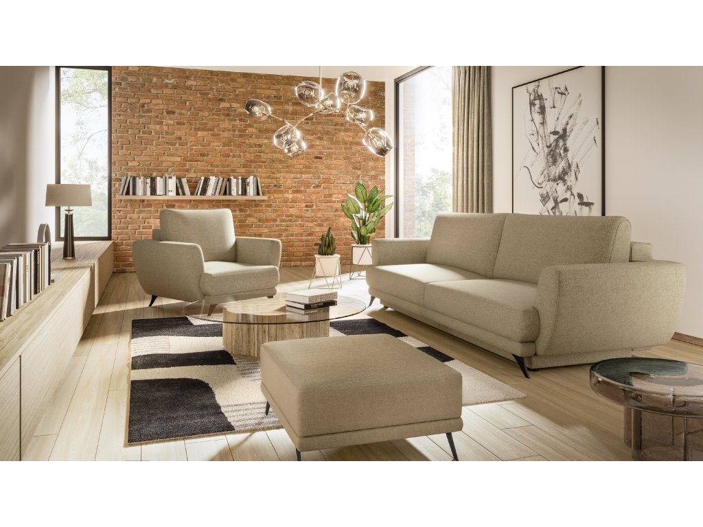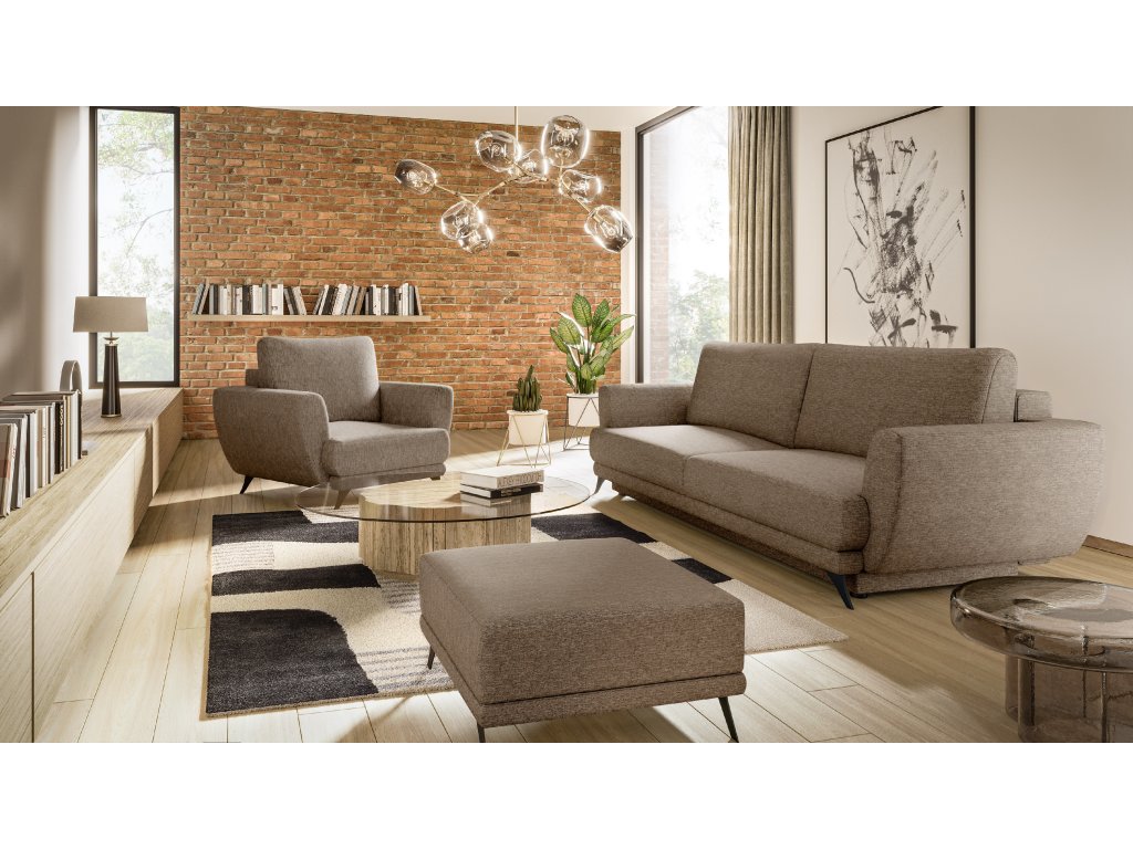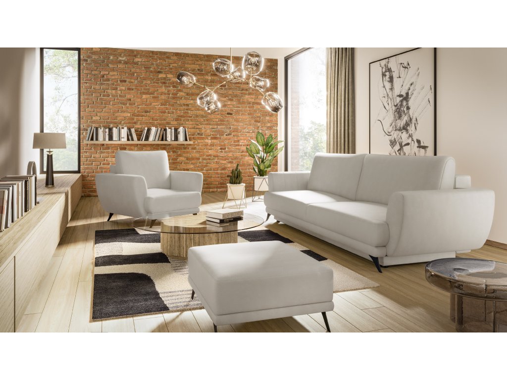 Design celé kolekce se nese v duchu moderní jednoduchosti – charakterizují ji vysoké područky netradičního tvaru, jemné prošívání a vyvážené proporce, které dodávají interiéru harmonii.