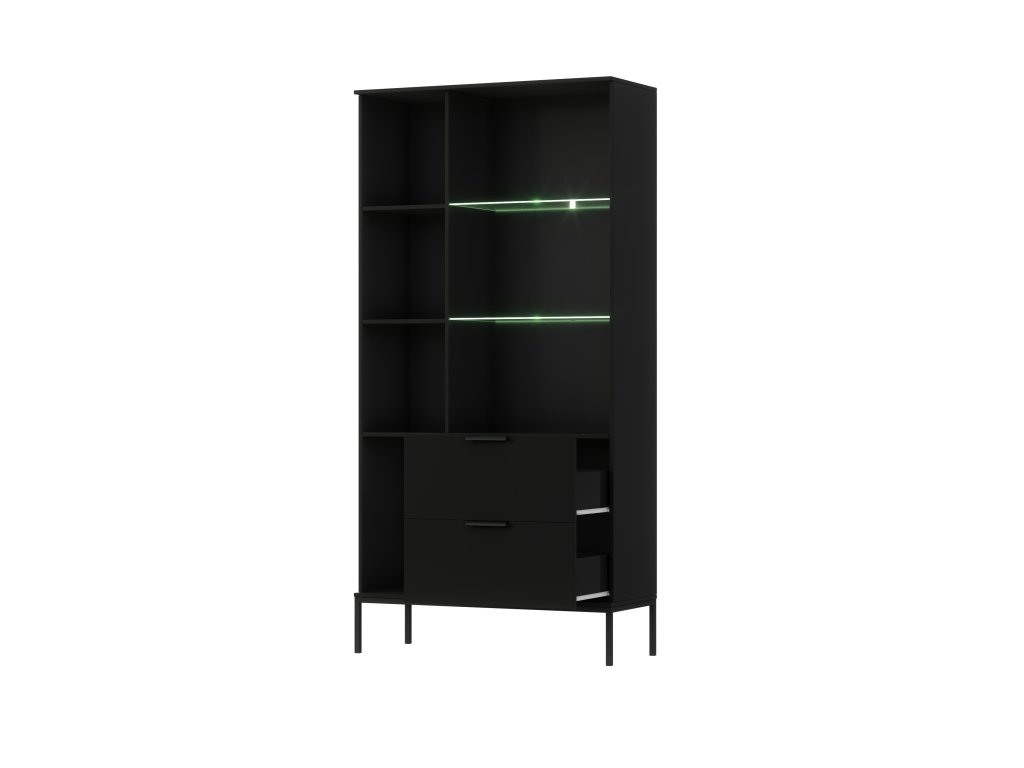 Za skleněnými dvířky se nachází skleněné police s LED osvětlením, které zvýrazní uložené dekorace nebo sbírkové předměty a dodají interiéru sofistikovaný nádech.