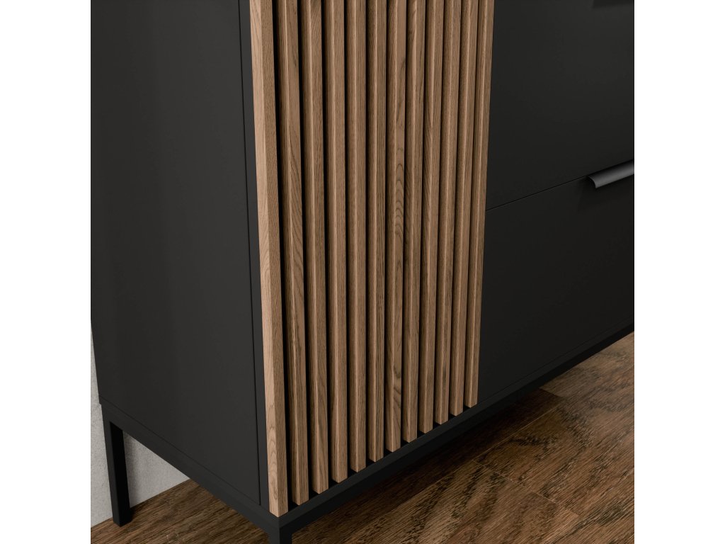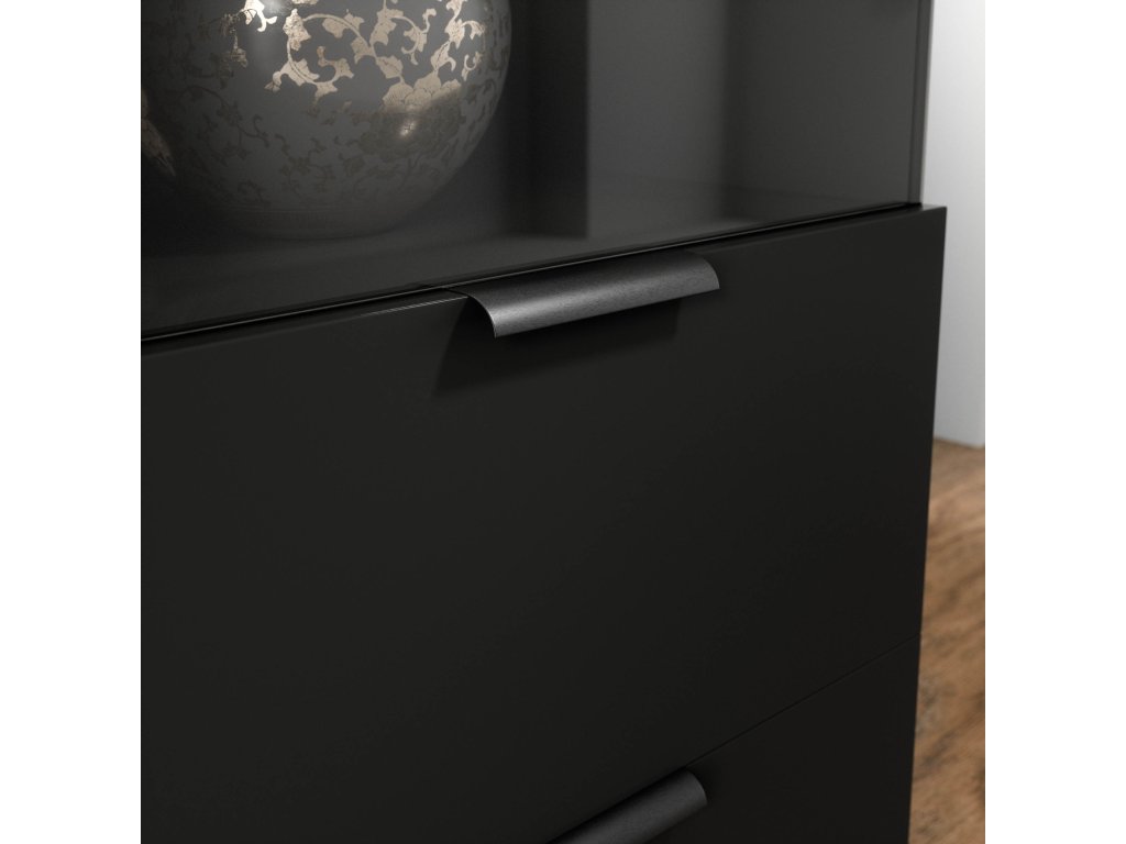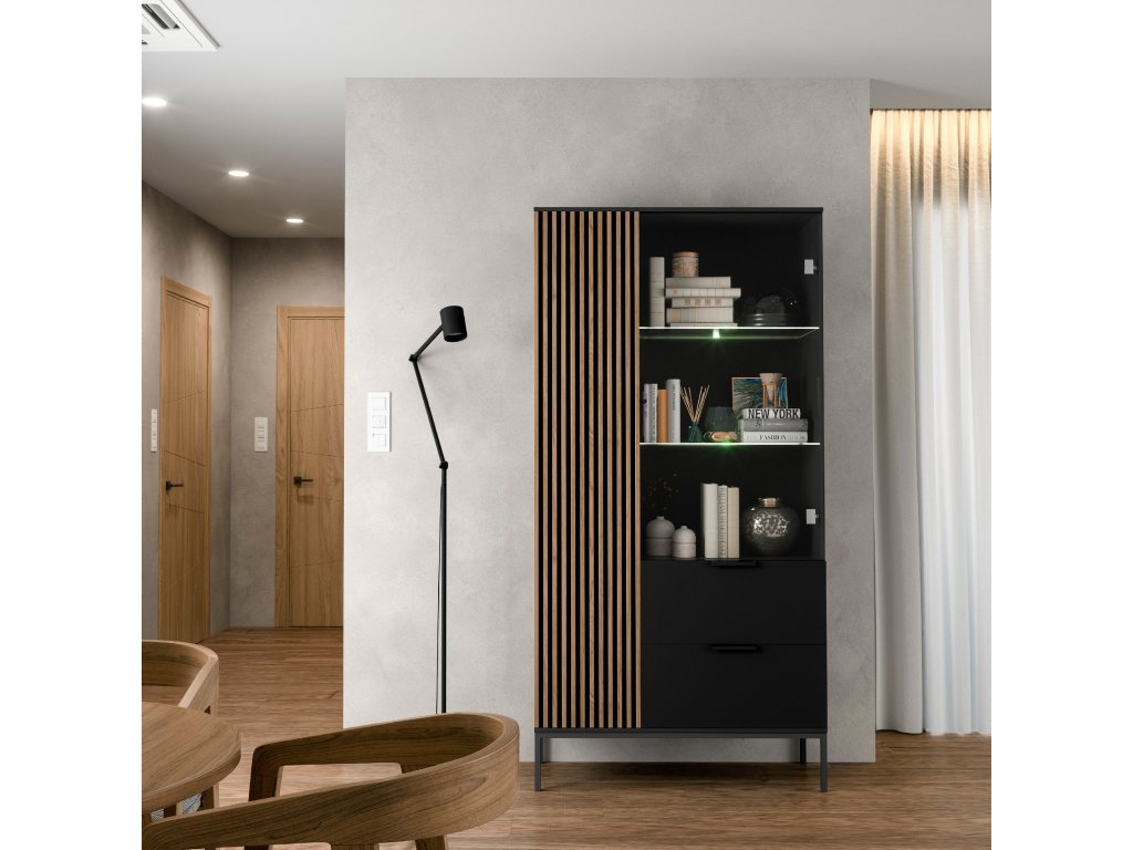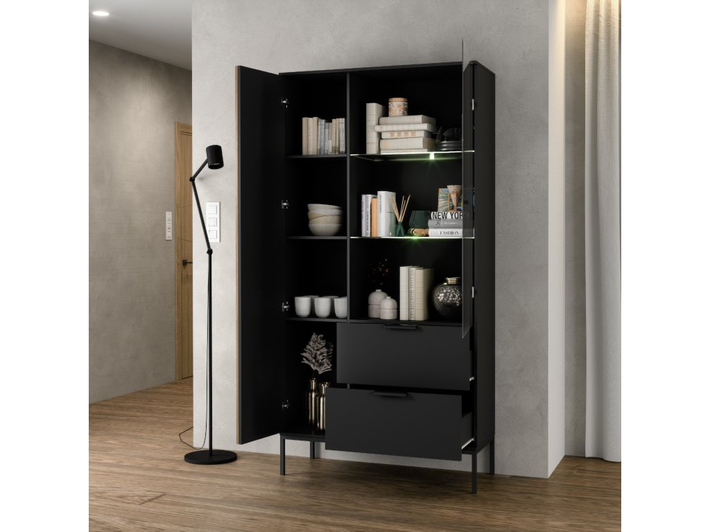 Vnitřní uspořádání zahrnuje dvě prostorné zásuvky s ABS hranou, což zvyšuje jejich odolnost proti poškození. Jedny dvířka s frézovaným čelem dodávají vitríně elegantní charakter, zatímco druhé skleněné dveře vytvářejí atraktivní vizuální efekt.