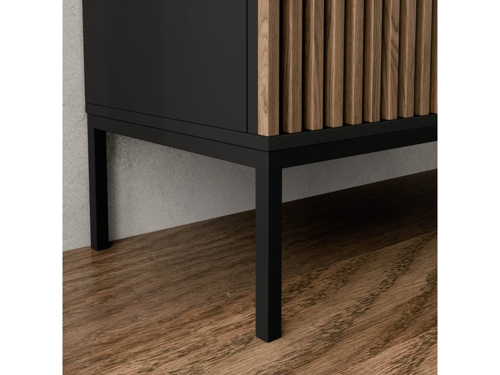 Konstrukce vitríny je vyrobena z odolné desky o tloušťce 16 mm, která zaručuje pevnost a dlouhou životnost. Stabilitu podporují kovové nohy o výšce 20 cm, které zároveň dodávají nábytku lehkost a moderní vzhled.