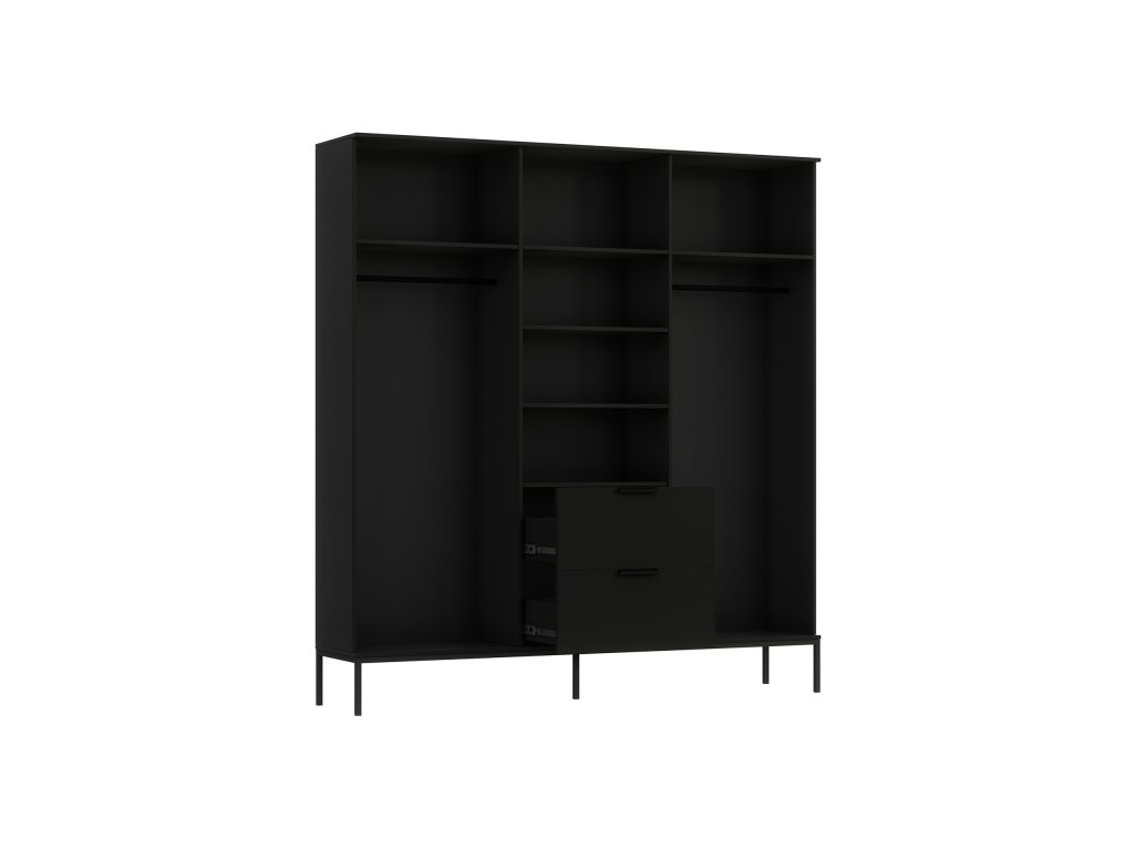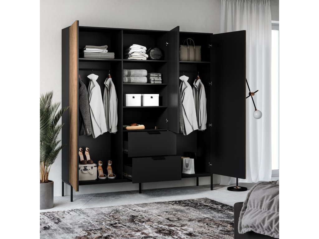 Nabízí mnoho možností uspořádání úložného prostoru – obsahuje dvě prostorné zásuvky s ABS hranou, která nejen zvyšuje estetiku, ale také chrání zásuvky před poškozením. Dále je vybavena dvěma šatními tyčemi pro pohodlné zavěšení oblečení a třemi páry dveří, z nichž dva mají elegantní frézované čelo. Součástí skříně je také šest polic, které umožňují přehledné třídění a ukládání různých předmětů.