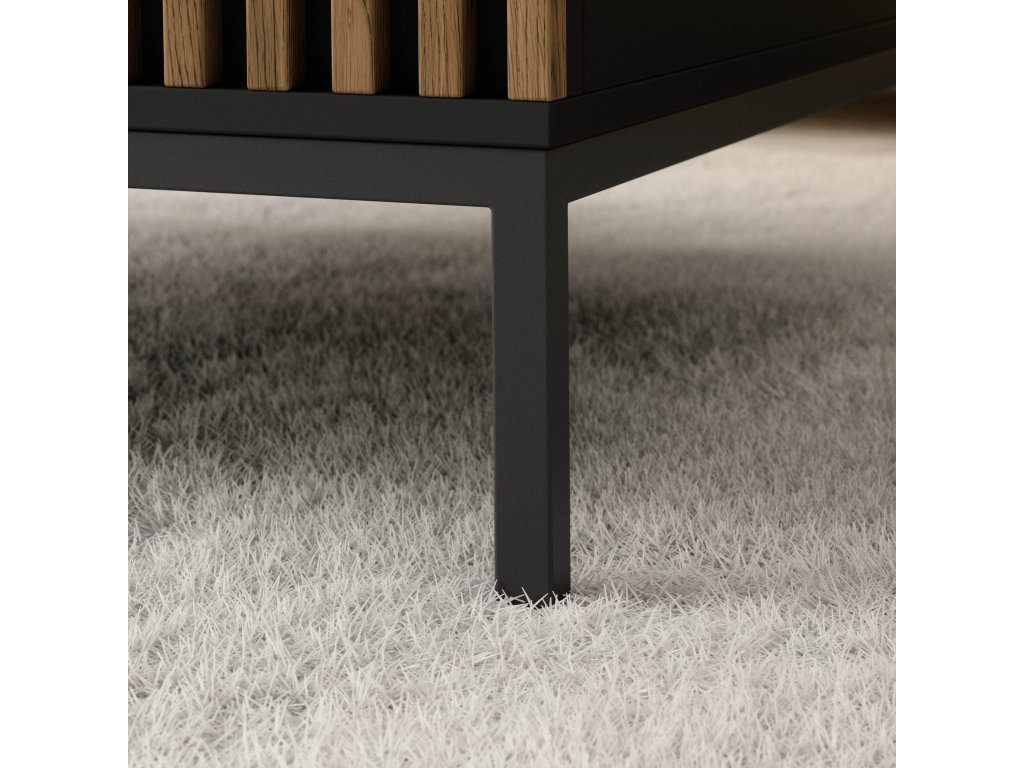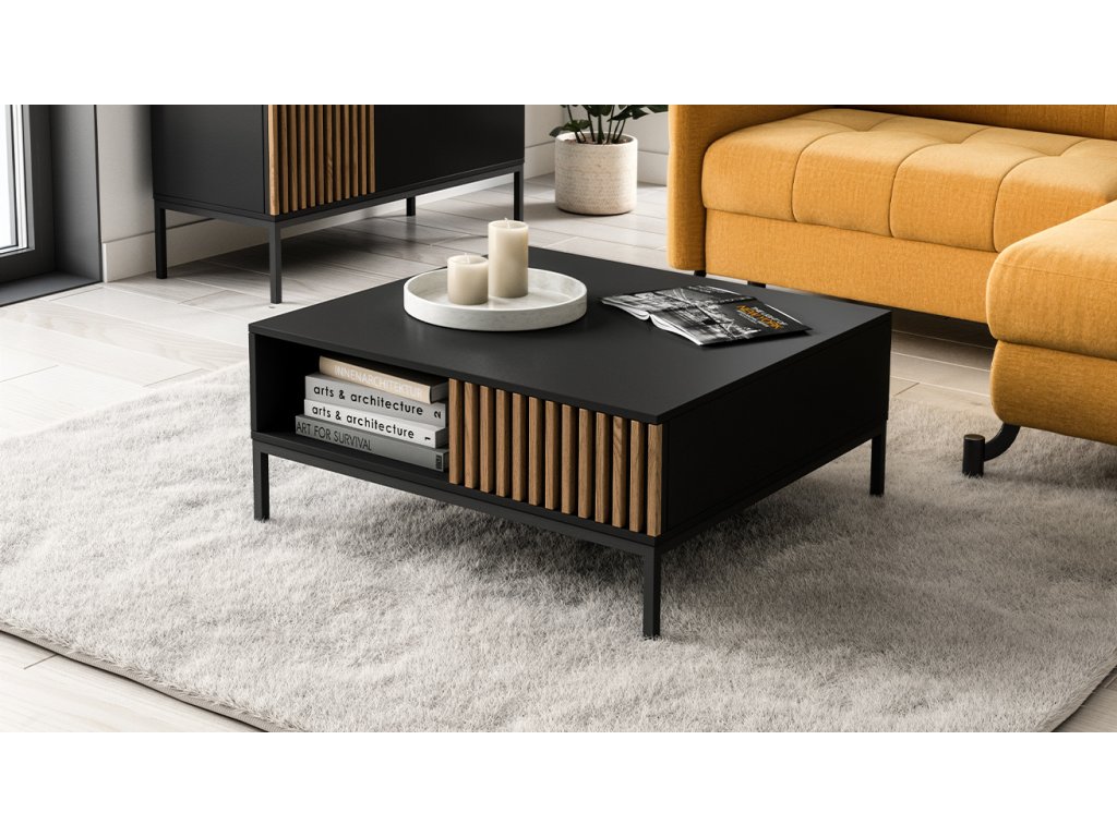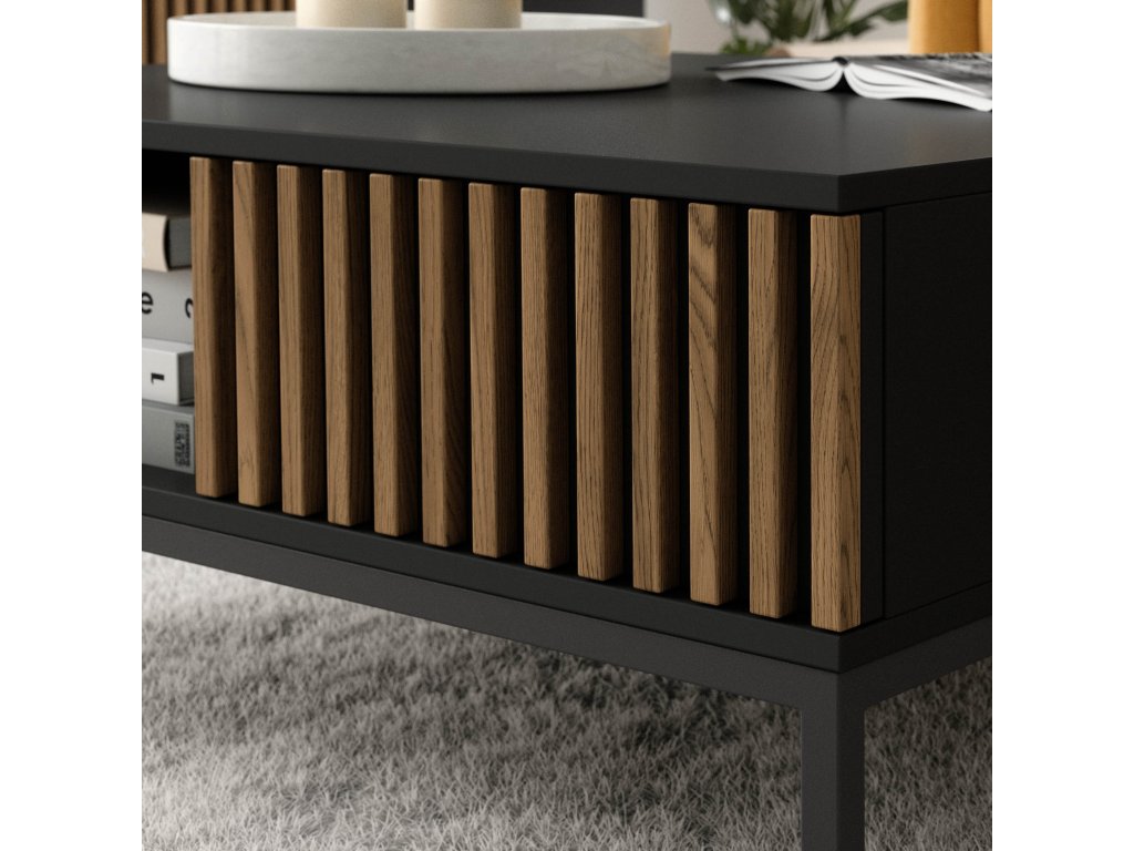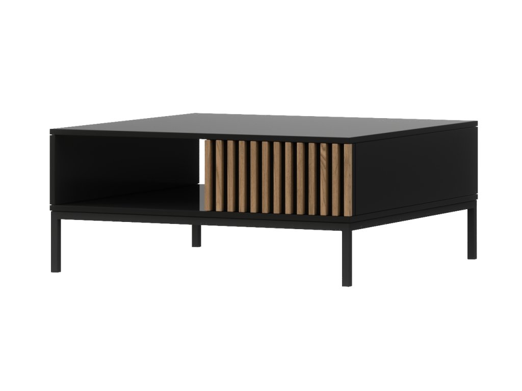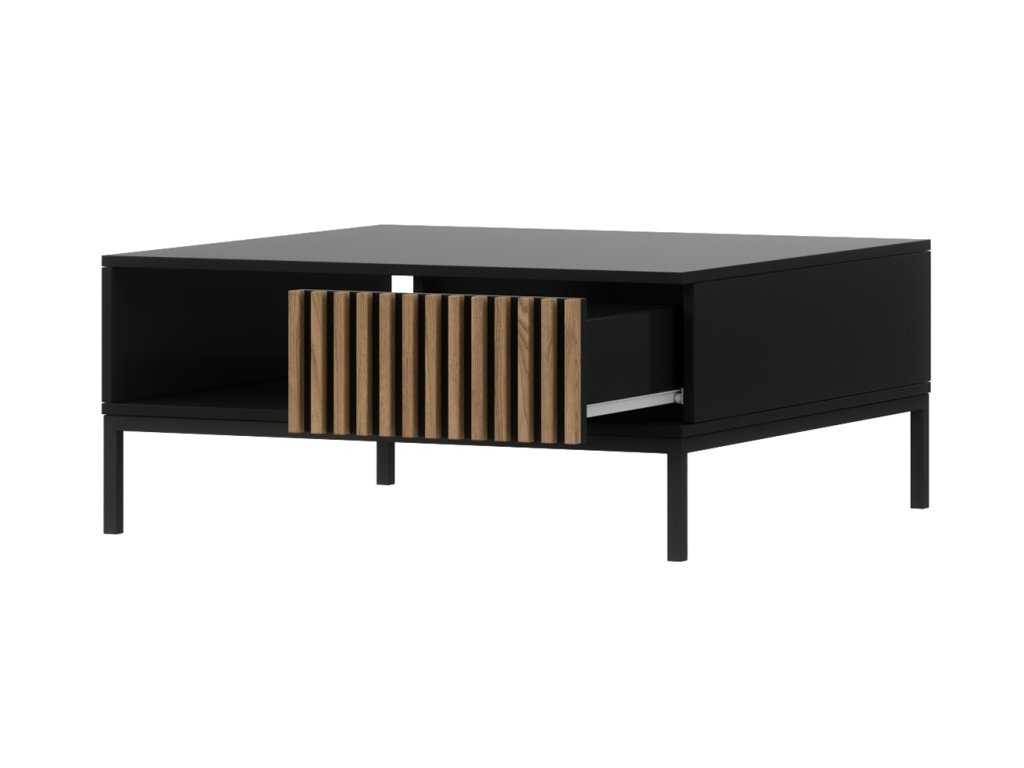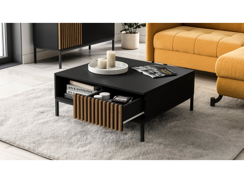 Konferenční stolek Meorati nabízí také praktická řešení – je vybaven jednou zásuvkou s jemně frézovaným čelem a otevřenou policí, která poskytuje prostor pro odkládání časopisů, knih nebo dekorací.