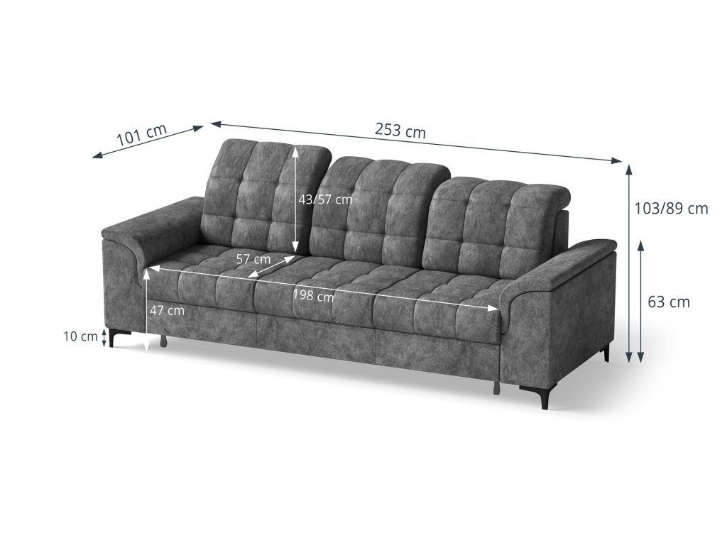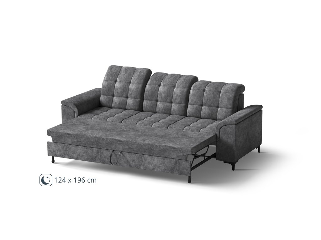 - Trojpohovka je vybavena rozkládacím mechanismem typu delfin, který umožňuje rychlou a snadnou proměnu v lůžko. Rozklad funguje na principu výsuvné spodní části, která se plynule vysune směrem dopředu a následně se jednoduchým pohybem zvedne do úrovně sedáku. Celý proces je intuitivní, nevyžaduje použití síly a zvládnete ho během několika vteřin.