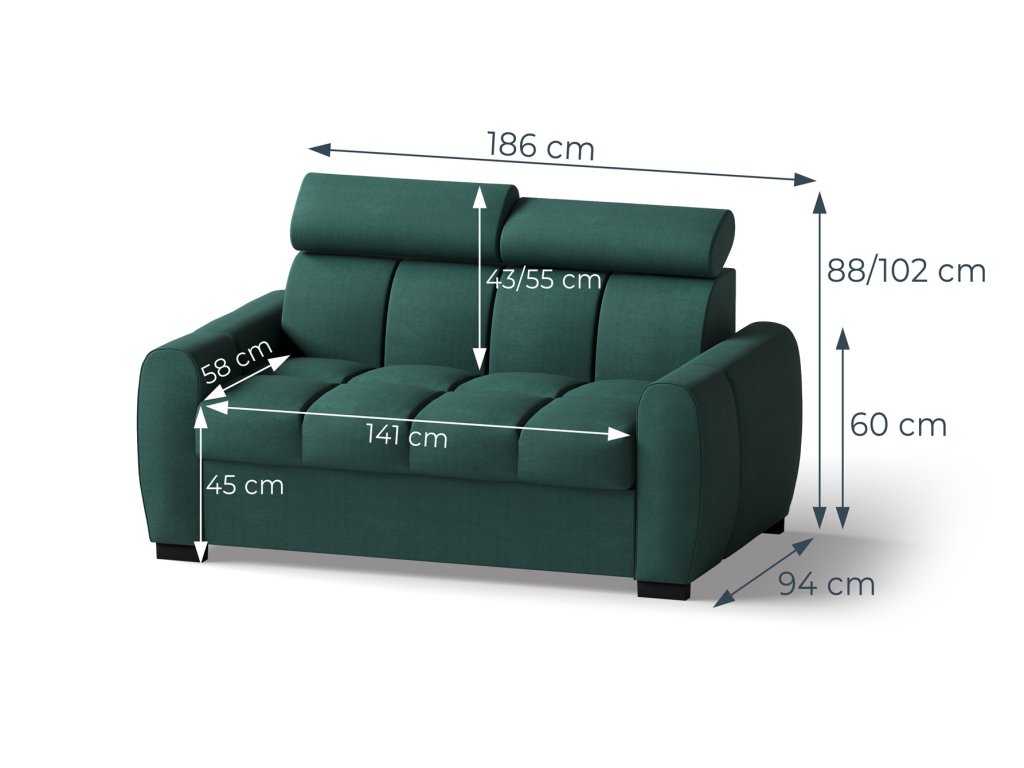 Dvojpohovka - Šířka 186 cm, Hloubka 94 cm, Výška 88-102 cm