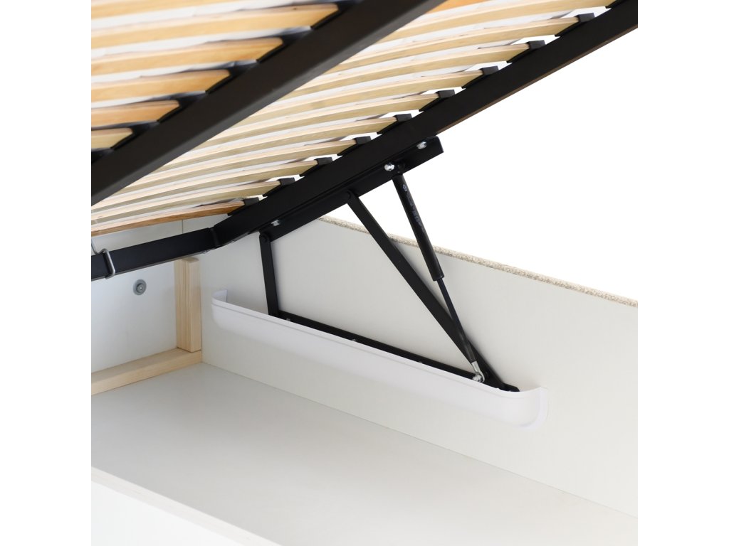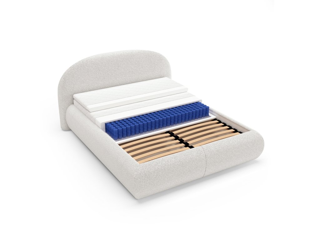 Díky plynovým zvedákům je přístup do prostorného úložného prostoru snadný a plynulý – ideální pro uskladnění lůžkovin či sezónních doplňků. Čalouněné čelo je potaženo látkou Catch Me, která zaujme svou výraznou bouclé strukturou s jemnými třásněmi a vytváří luxusní 3D efekt.