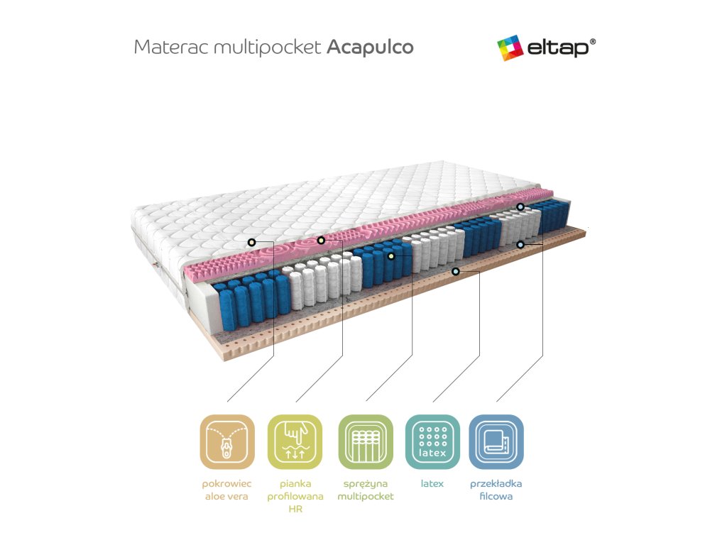 Matrace ACAPULCO je výrobek vyrobený z těch nejkvalitnějších materiálů, ideální pro ty, kteří si potrpí na špičkovou kvalitu spánku. Díky použití multipocketové pružiny, která je z jedné strany obklopena vysoce elastickou HR pěnou a z druhé strany latexovou pěnou, jde o matraci mimořádně pohodlnou a odolnou. Další vrstvu ochrany tvoří filcové podložky, které chrání pěny před deformacemi a prodlužují životnost matrace. Celá konstrukce je uzavřena ve snímatelném potahu Silk, který zajišťuje snadnou údržbu a elegantní vzhled.Doplňkové parametry