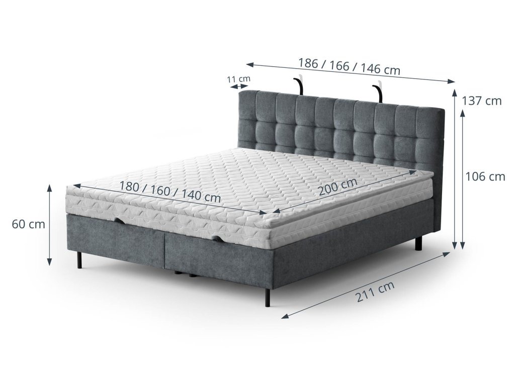 Postel Muna představuje dokonalé spojení moderního designu, komfortu a praktických funkcí. Elegantní čalouněné čelo s dekorativním prošíváním doplňují dvě nastavitelné kovové lampičky s USB dobíjecím portem a napájecím adaptérem (15W TUV) – ideální pro večerní čtení nebo pohodlné nabíjení telefonu.