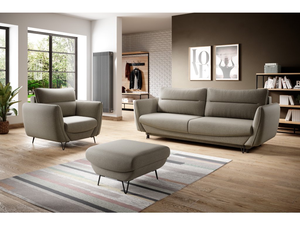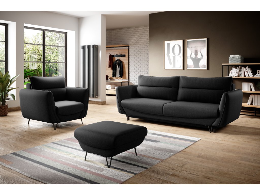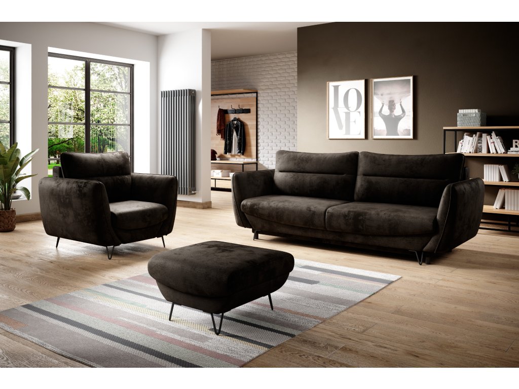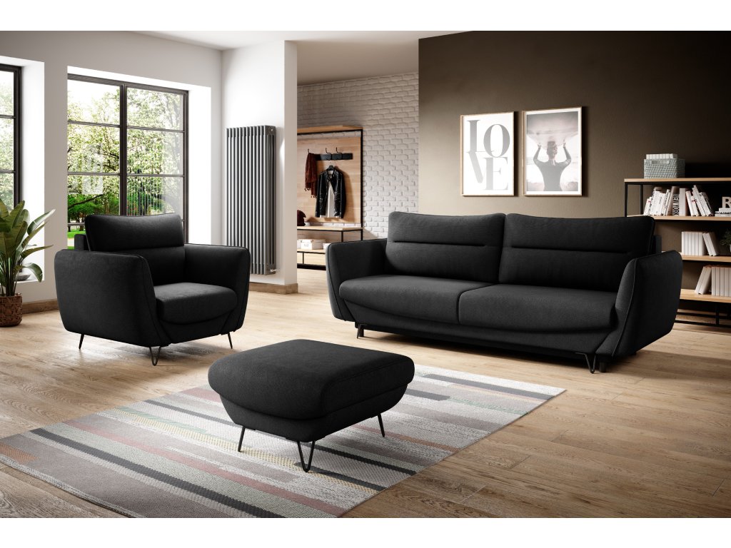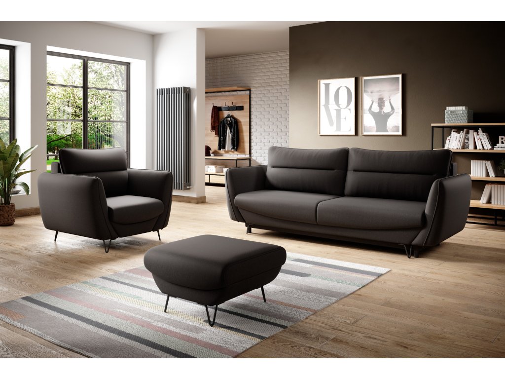 Sestava Silva je třídílný komplet, který zahrnuje pohovku, křeslo a taburet. Všechny kusy jsou čalouněné a mají přirozeně elegantní vzhled. Výrazným prvkem celé kolekce jsou moderní černé ocelové nožky s originálním designem, které dodávají jednoduchým tvarům nábytku designérský charakter.