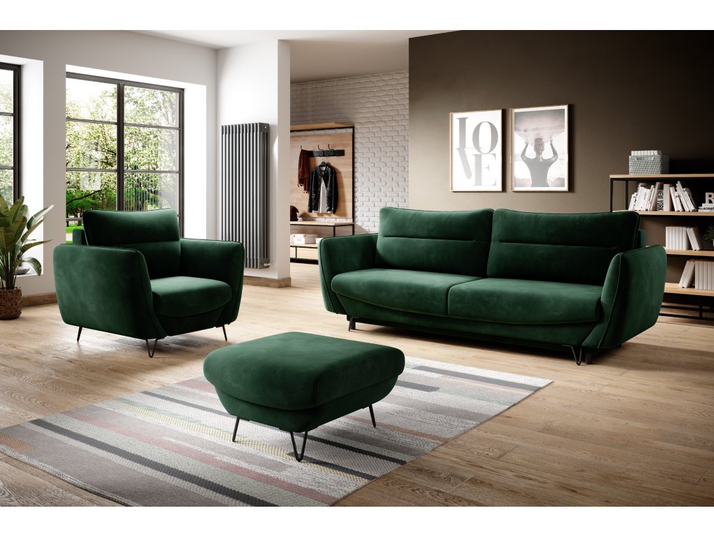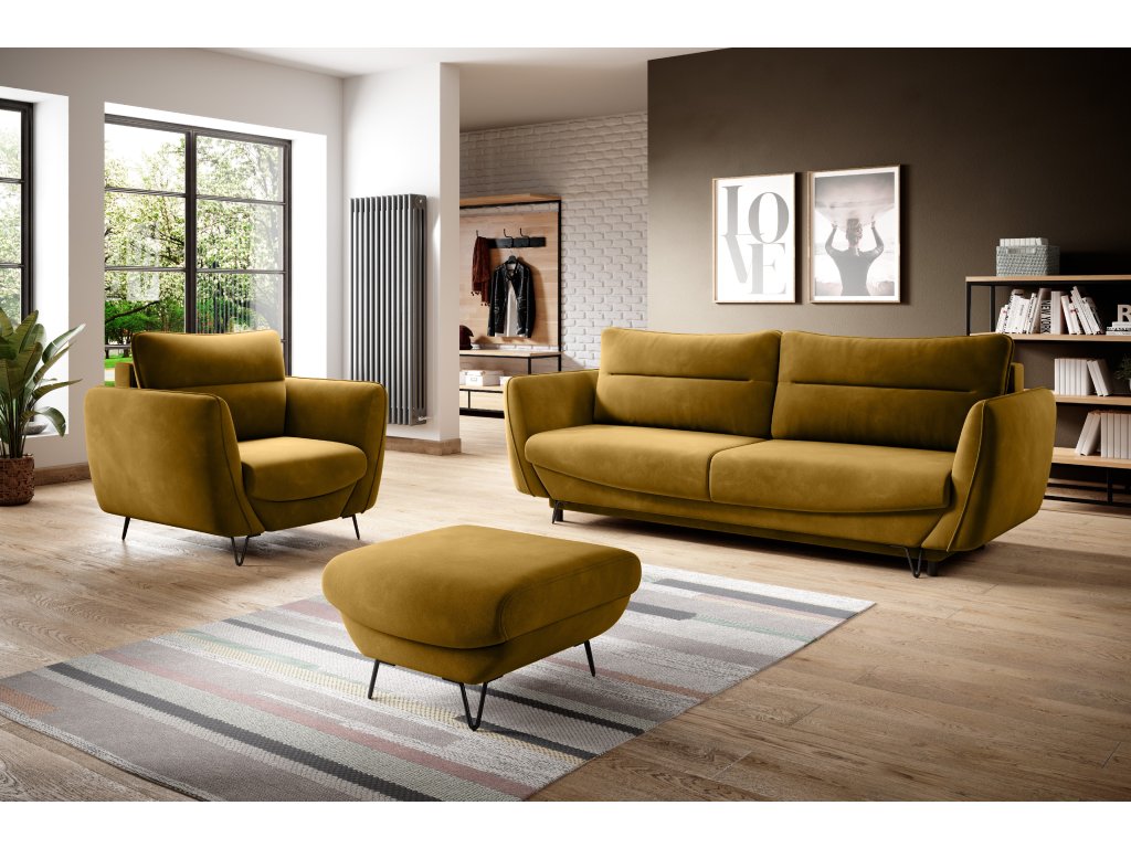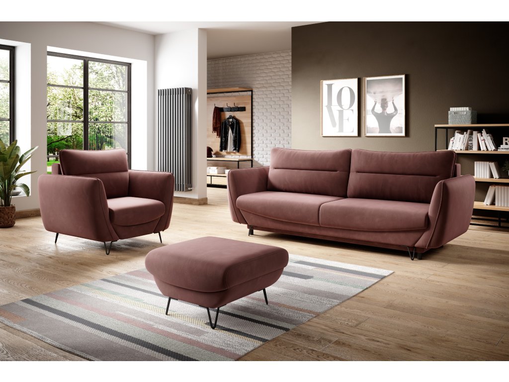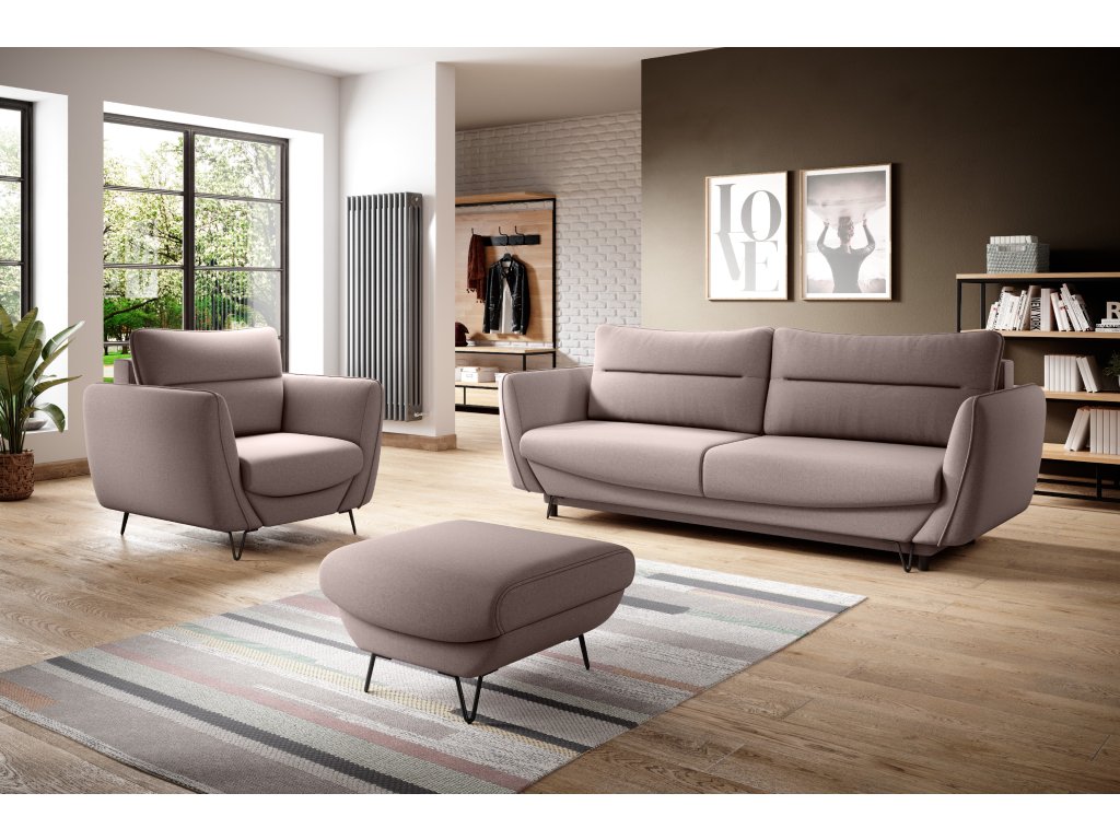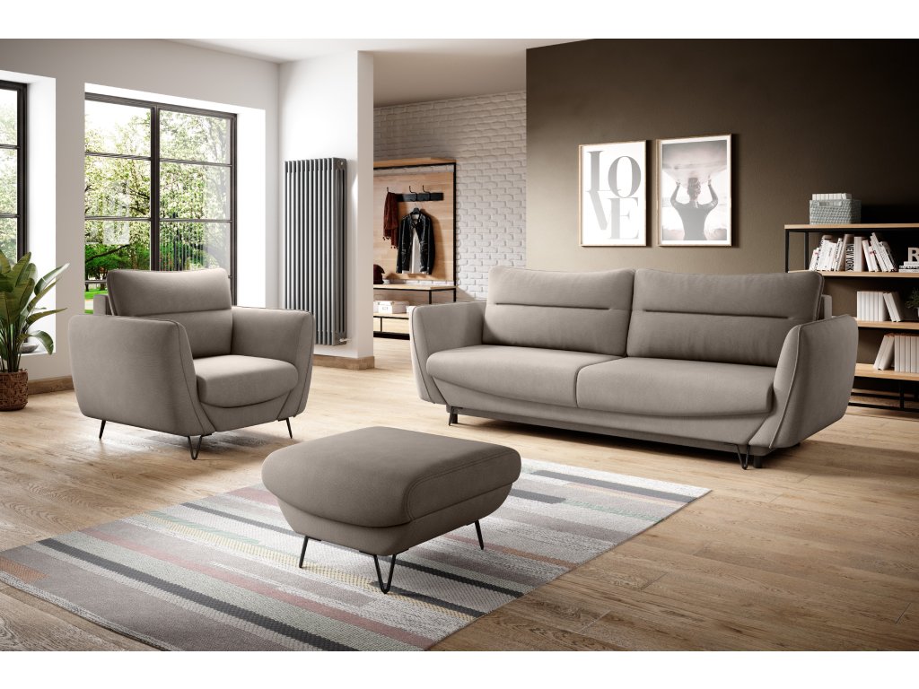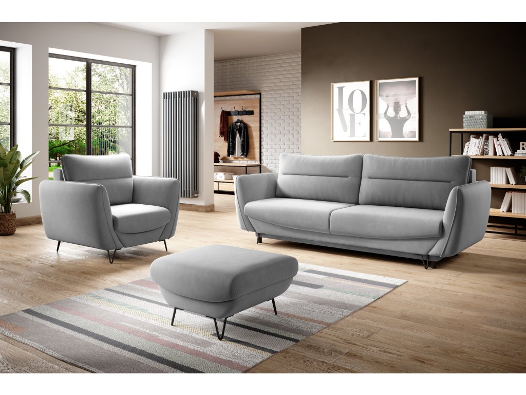 Sestava Silva je třídílný komplet, který zahrnuje pohovku, křeslo a taburet. Všechny kusy jsou čalouněné a mají přirozeně elegantní vzhled. Výrazným prvkem celé kolekce jsou moderní černé ocelové nožky s originálním designem, které dodávají jednoduchým tvarům nábytku designérský charakter.