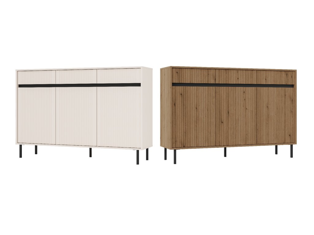 - Stabilitu nábytku zajišťují černé kovové nožky o výšce 15 cm. Jejich minimalistický design podtrhuje moderní charakter komody, zatímco zvýšená výška usnadňuje úklid pod nábytkem a přidává na vizuální lehkosti celku.