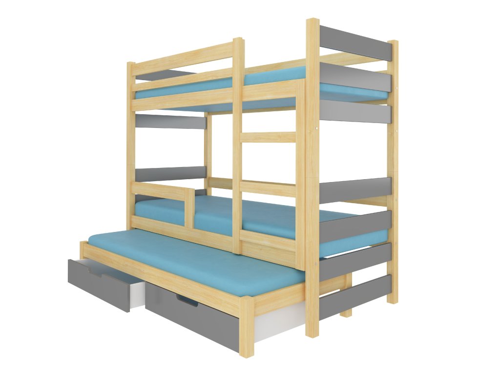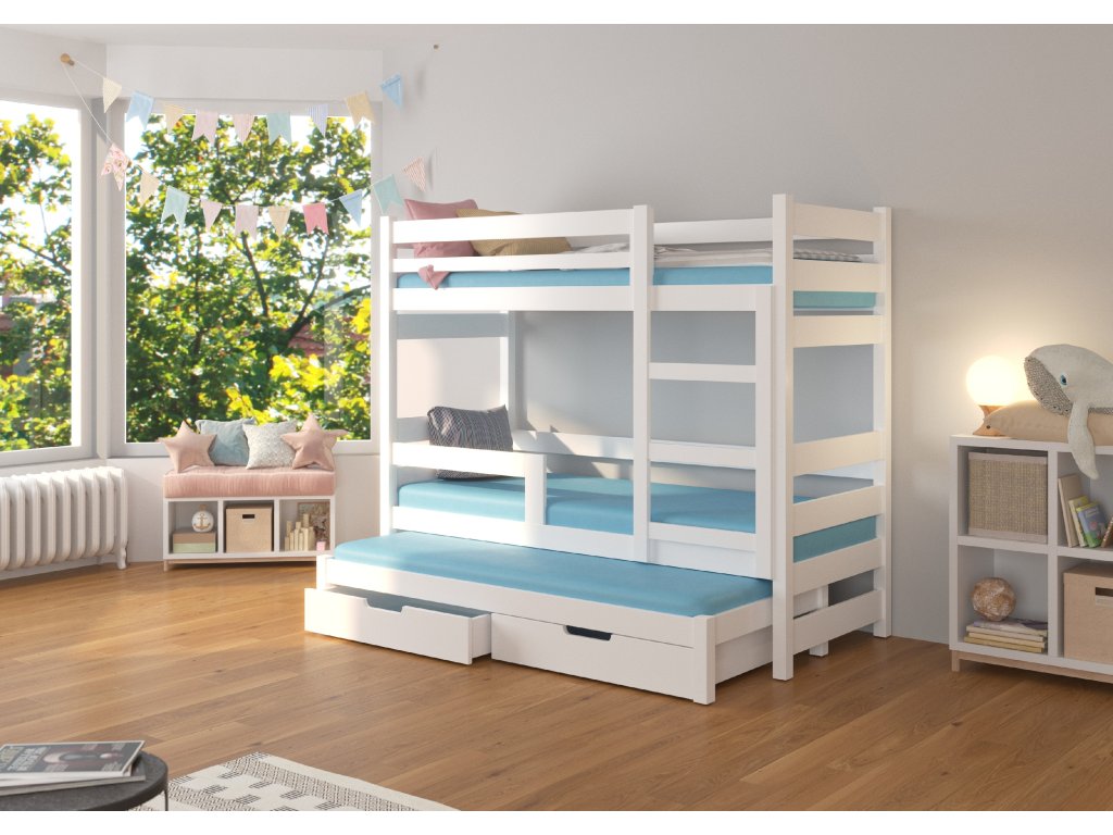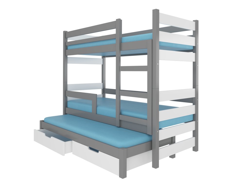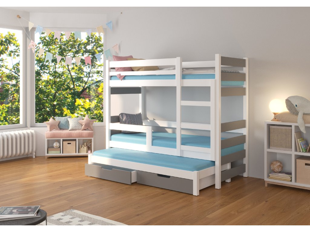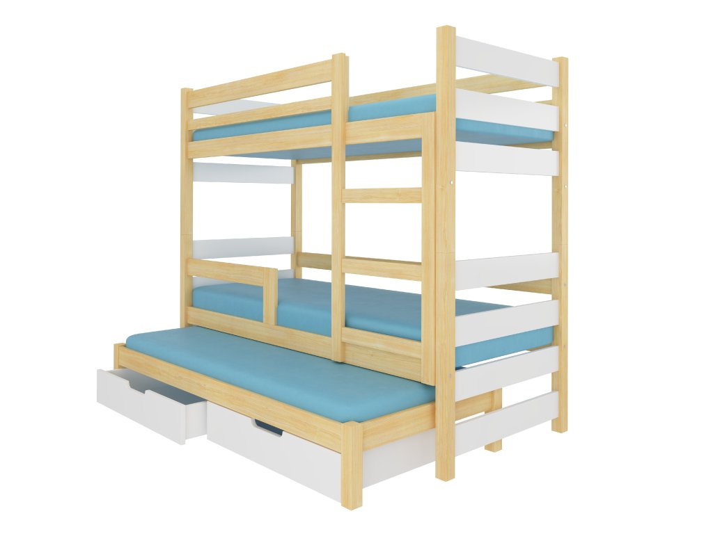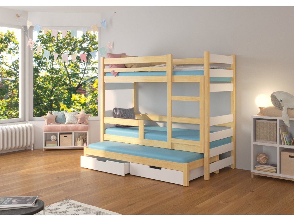Patrová třípostelová postel KARLO je skvělým nápadem na úsporu místa v malém dětském pokoji. Nábytek má stabilní schodovou žebřík a ochranné zábrany umístěné téměř po celé délce postele, díky čemuž máte jistotu, že vaše dítě bude během spánku zcela v bezpečí. Navíc se na spodní části nacházejí dvě prostorné a funkční zásuvky na ložní prádlo. Společně s postelí obdržíte kompletní sadu tří pěnových matrací s bavlněnými potahy, které lze snadno sundat a vyprat.Doplňkové parametry