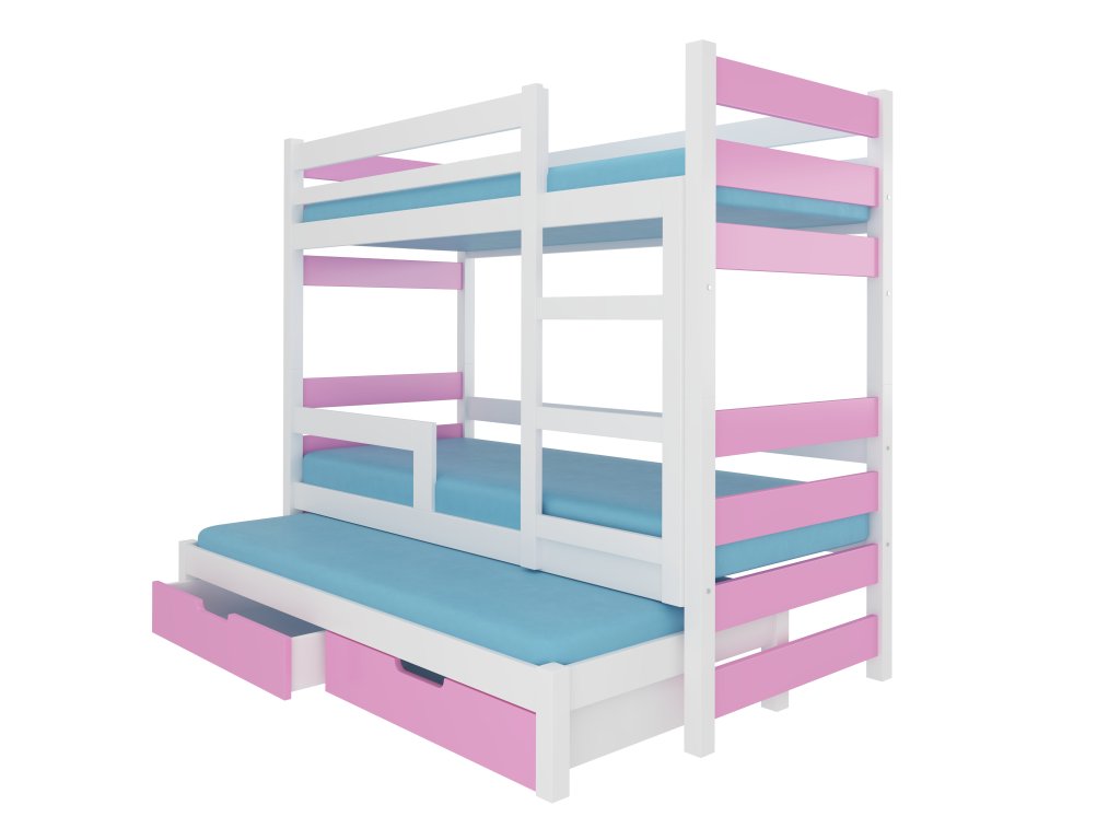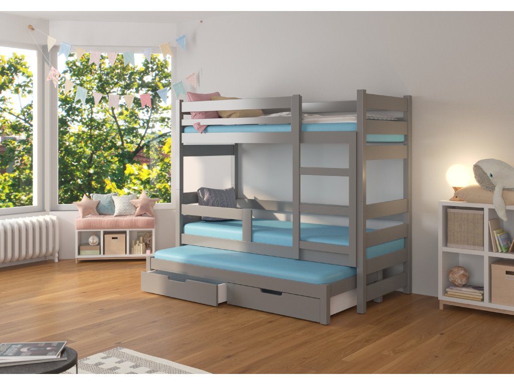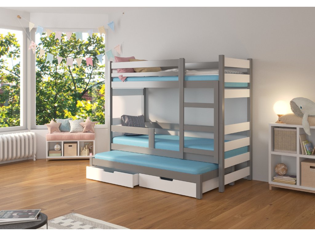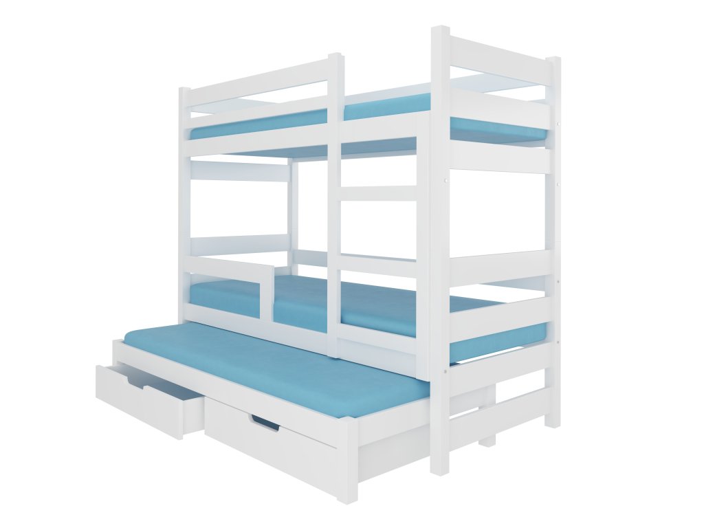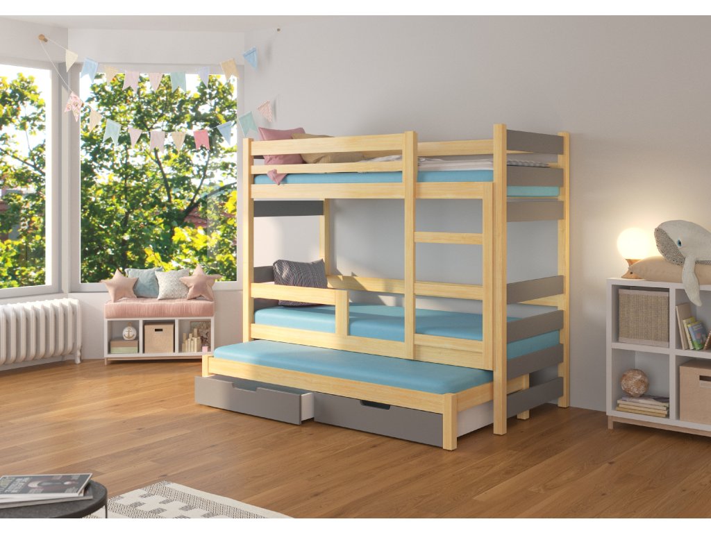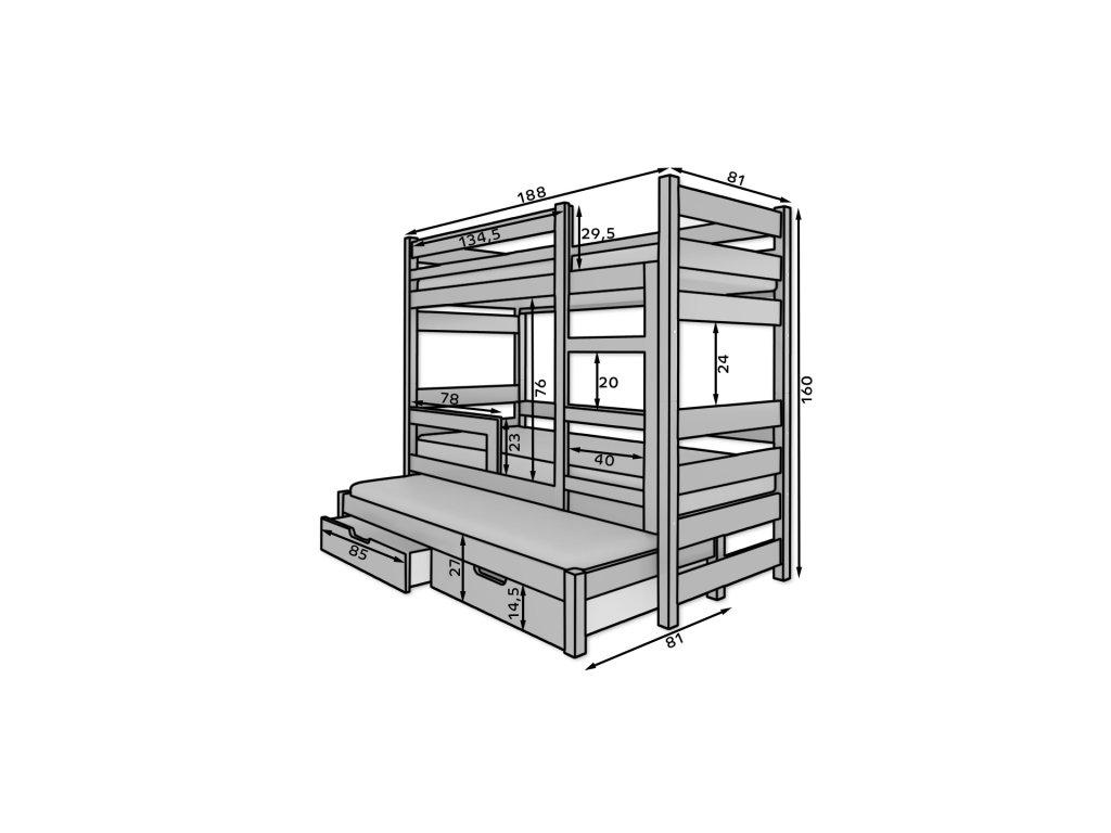 Patrová třípostelová postel KARLO je skvělým nápadem na úsporu místa v malém dětském pokoji. Nábytek má stabilní schodovou žebřík a ochranné zábrany umístěné téměř po celé délce postele, díky čemuž máte jistotu, že vaše dítě bude během spánku zcela v bezpečí. Navíc se na spodní části nacházejí dvě prostorné a funkční zásuvky na ložní prádlo. Společně s postelí obdržíte kompletní sadu tří pěnových matrací s bavlněnými potahy, které lze snadno sundat a vyprat.Doplňkové parametry
