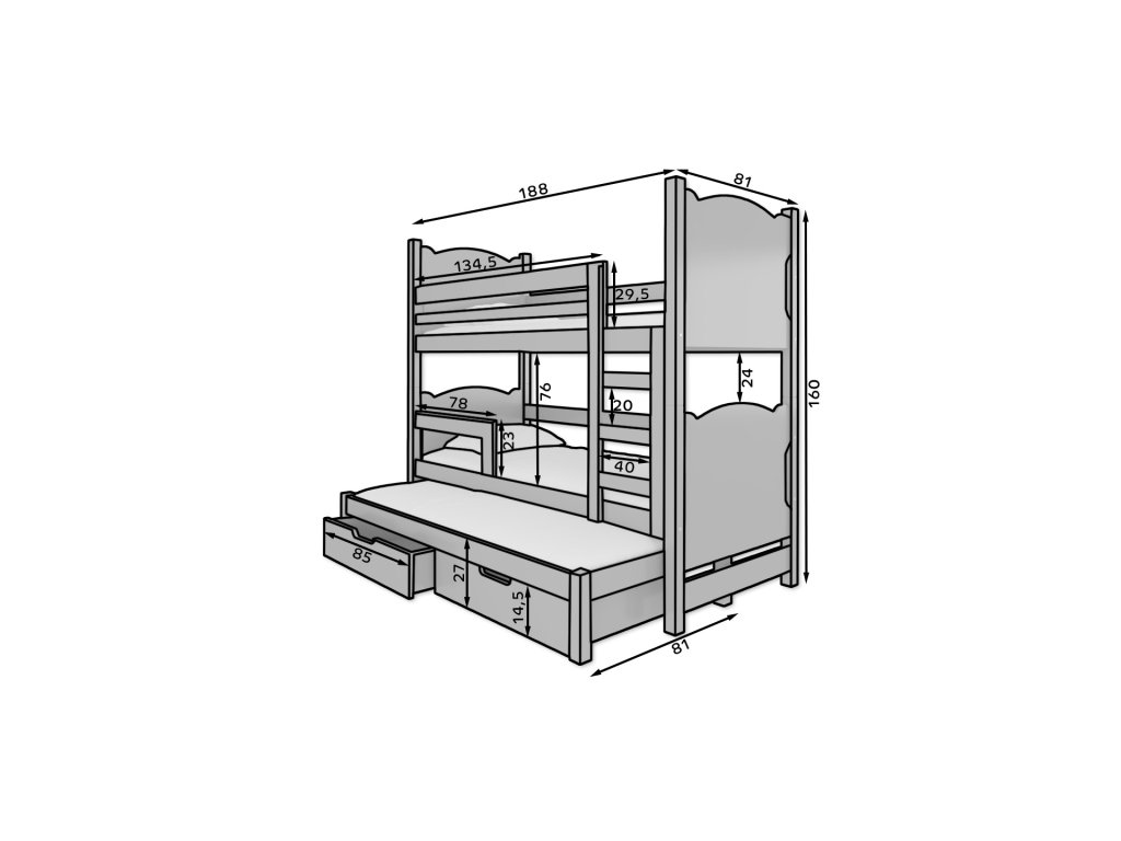Patrová třípostelová postel LETICIA je skvělým nápadem na úsporu místa v malém dětském pokoji. Nábytek má stabilní schodovou žebřík a ochranné zábrany umístěné téměř po celé délce postele, díky čemuž máte jistotu, že vaše dítě bude během spánku zcela v bezpečí. Navíc se na spodní části nacházejí dvě prostorné a funkční zásuvky na ložní prádlo. Společně s postelí obdržíte kompletní sadu tří pěnových matrací s bavlněnými potahy, které lze snadno sundat a vyprat.Doplňkové parametry