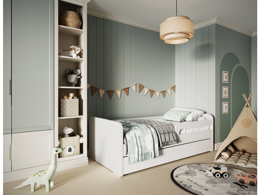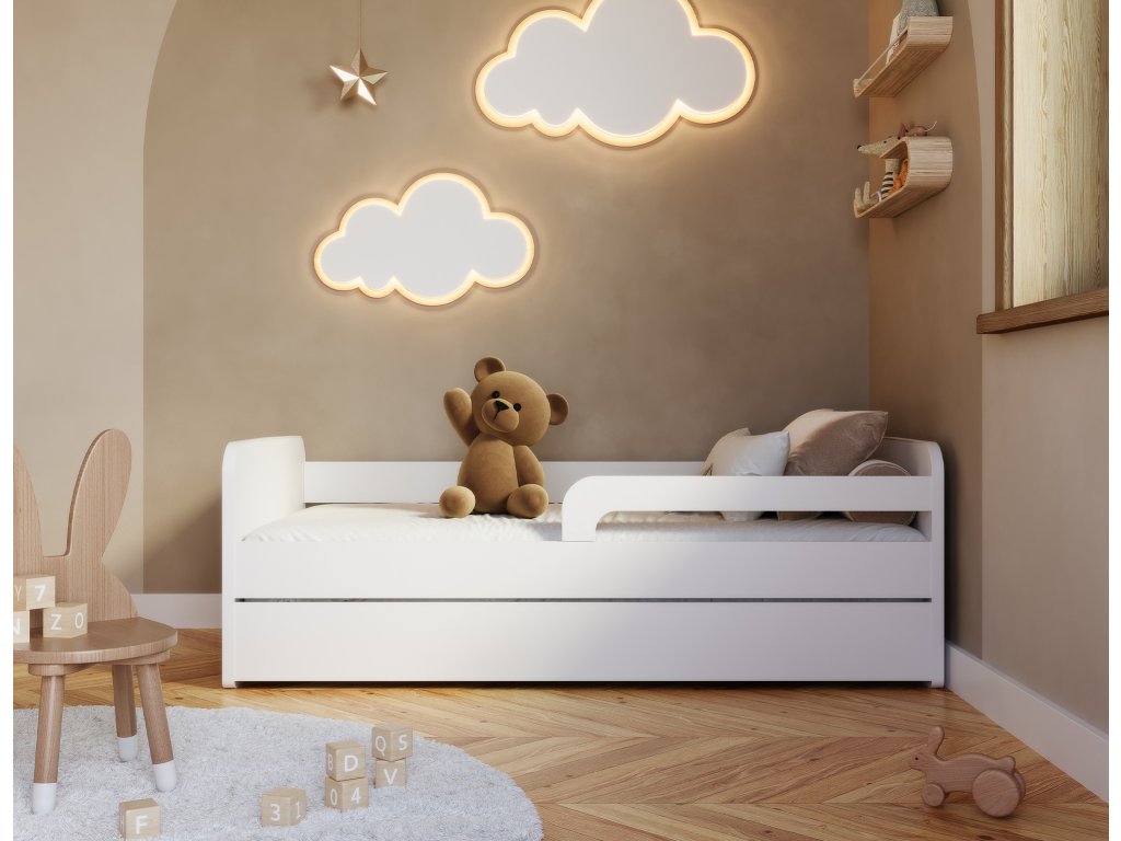 Dětská postel Duuli je moderní nábytek s univerzálním designem, který se dokonale hodí do každého dětského pokoje. Pevný rám v klasické bílé barvě dodává lehkost a eleganci, čímž zdůrazňuje jeho nadčasový charakter. Postel je vybavena bezpečnostní zábranou, která zajišťuje maximální bezpečnost během spánku a chrání dítě před nechtěným vypadnutím. K dispozici jsou dvě varianty – s matrací nebo bez – což umožňuje přizpůsobení individuálním potřebám. Absence úložného prostoru na ložní prádlo činí konstrukci lehkou, jednoduchou a ideálně zapadající do minimalistického, moderního stylu. Postel Duuli spojuje estetiku, funkčnost a bezpečnost a je ideálním řešením pro pohodlný odpočinek vašeho dítěte.Doplňkové parametry