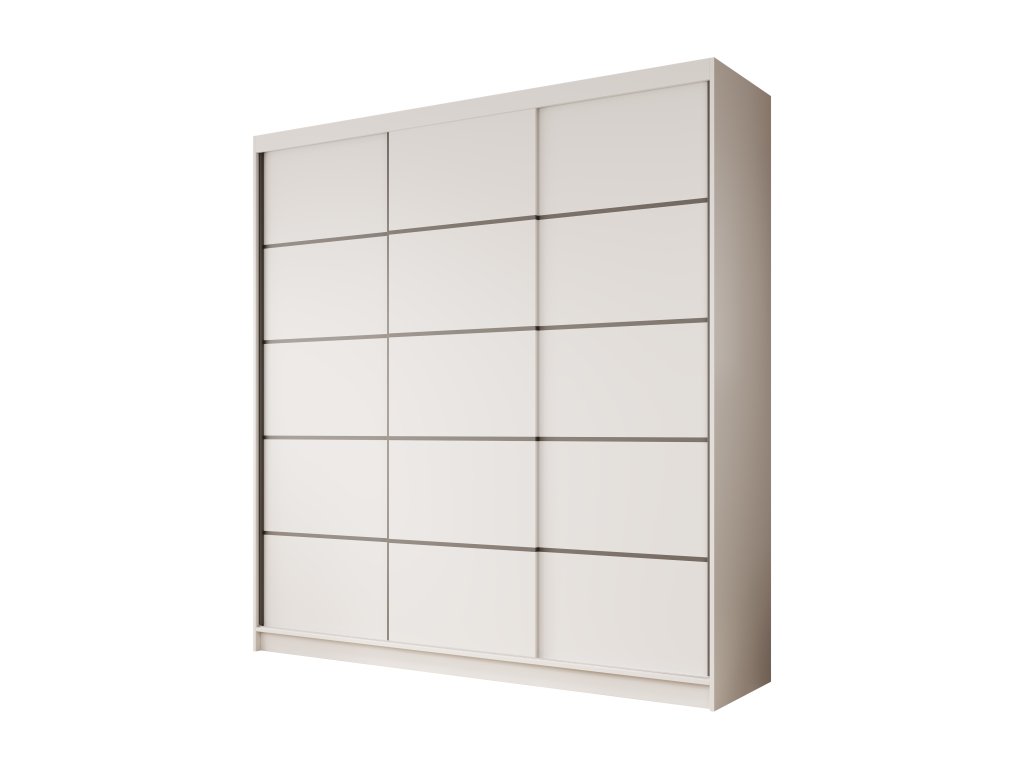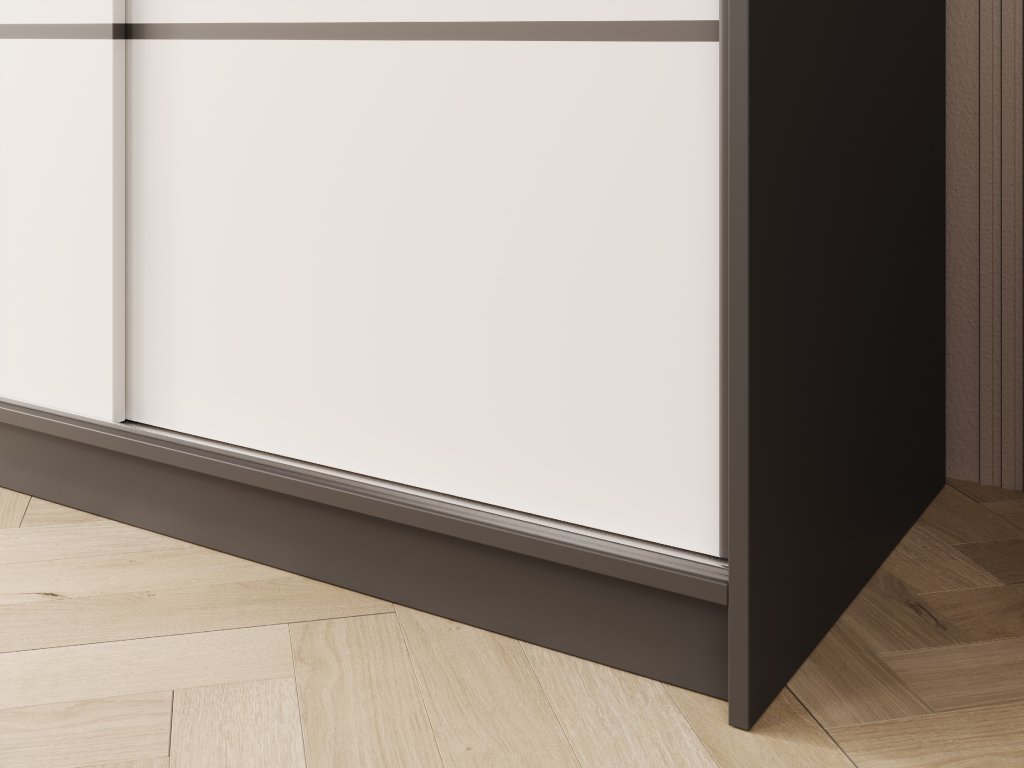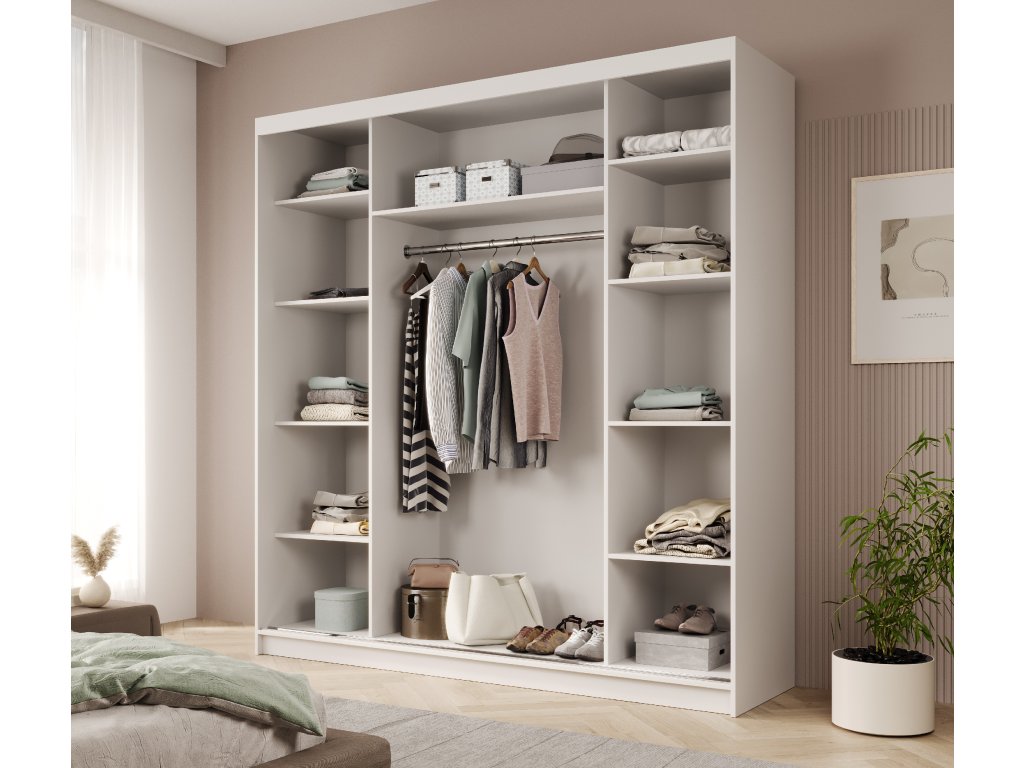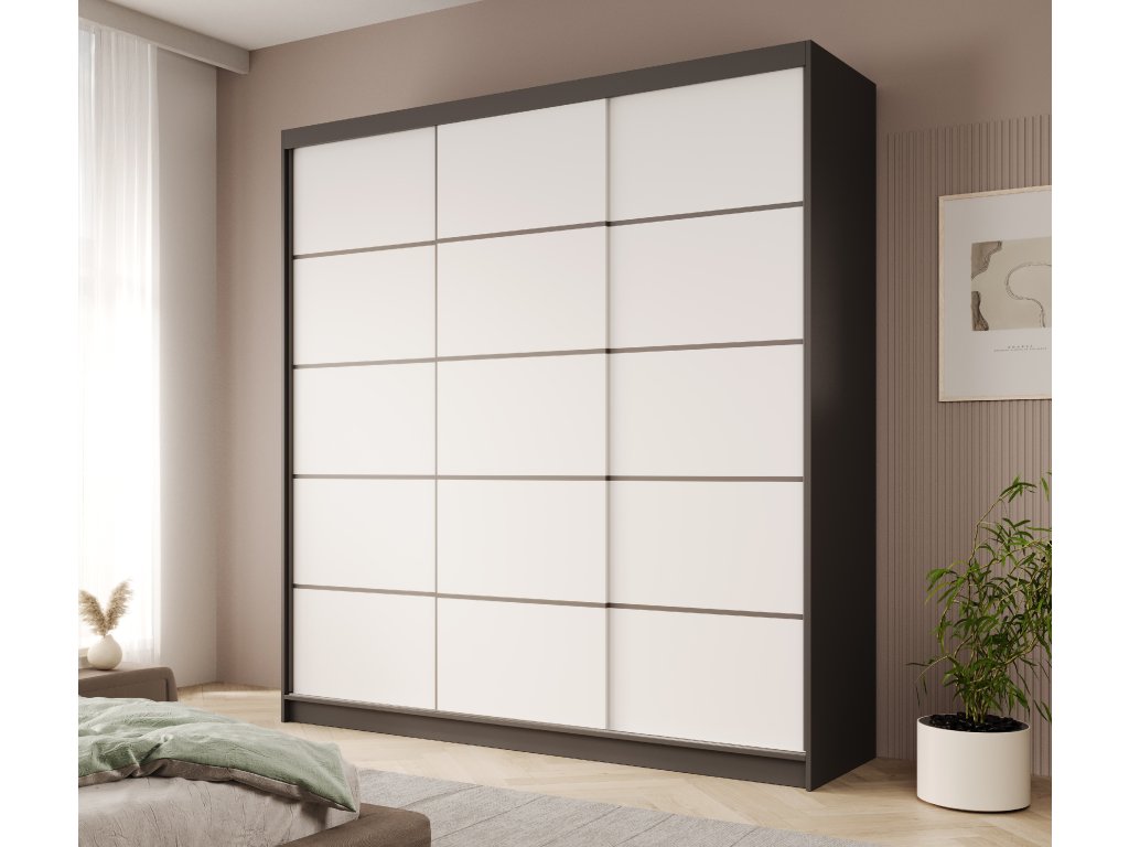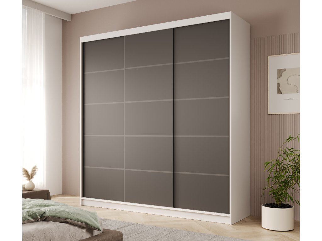 Posuvná šatní skříň Greta 200 je moderní a funkční řešení, které se skvěle hodí do každé ložnice, šatny nebo předsíně. Její minimalistický tvar, geometrické členění čel a pečlivá povrchová úprava dodávají interiéru elegantní a nadčasový charakter. Nábytek byl vyroben z vysoce kvalitní laminované desky o tloušťce 16 mm, odolné proti poškrábání, vlhkosti a UV záření, což zaručuje trvanlivost a estetiku po mnoho let používání. Skříň je vybavena systémem posuvných dveří, který zajišťuje pohodlné otevírání a zavírání a zároveň šetří místo - ideální pro menší místnosti. Vnitřní prostor skříně byl navržen s ohledem na maximální funkčnost - nachází se zde sada polic a tyčí, díky nimž můžete snadno uspořádat své oblečení, doplňky a další předměty denní potřeby. Model Greta 200 je k dispozici v pěti barevných provedeních: v klasické bílé, elegantní černé, moderní kombinaci bílá + černá, černá + bílá a v módním kašmírovém odstínu.Doplňkové parametry