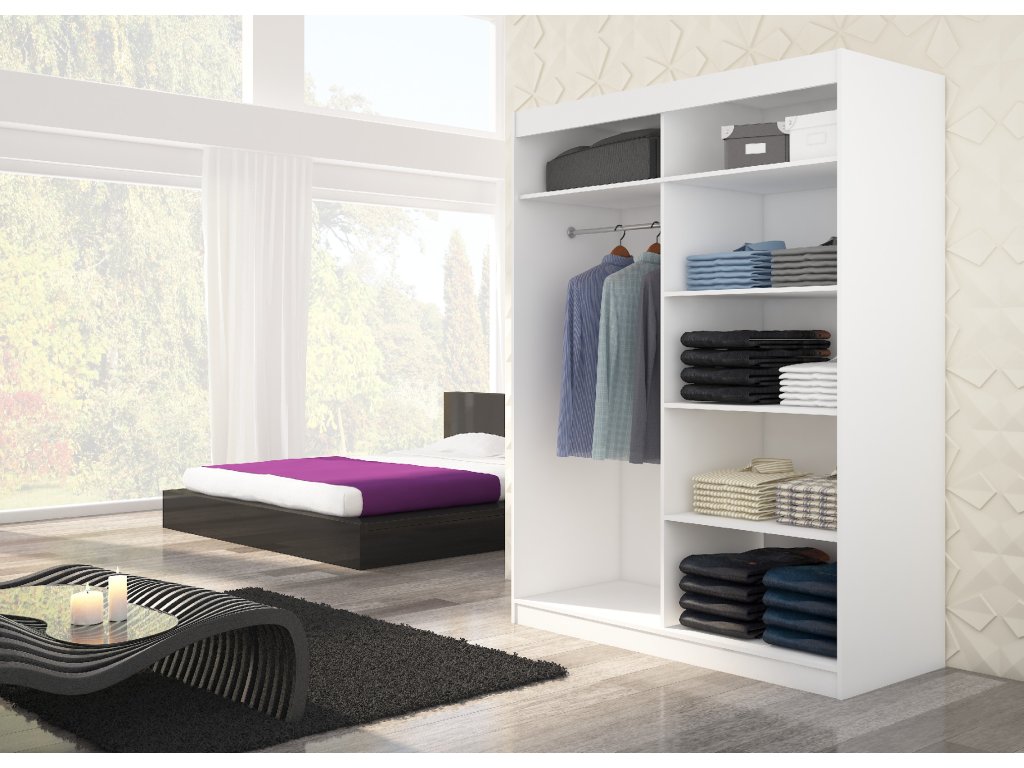 Posuvná šatní skříň RENZO se zrcadlem je ideálním způsobem, jak uspořádat svůj prostor. Nábytek je vybaven prostornými policemi a tyčí, na kterou můžete zavěsit šaty, obleky, svrchní oblečení nebo košile. Na přední straně je připevněno zrcadlo, které opticky zvětšuje prostor. Díky tomu, že je skříň posuvná, nemusíte pro otevírání dveří vyčlenit další prostor, což z ní činí ideální řešení pro malé místnosti nebo úzké chodby. Zajímavým prvkem je efektivní LED osvětlení, které dodává skříni i místnosti nádherné kouzlo.Doplňkové parametry