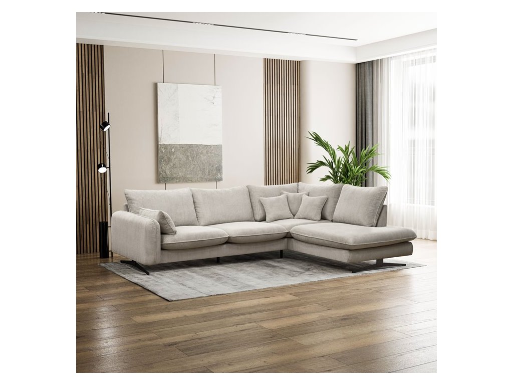 Sedačka je pravá nebo levá, s čalouněným zadním dílem, takže ji lze umístit i volně v prostoru. Ozdobné kovové nohy dodávají moderní a elegantní vzhled.