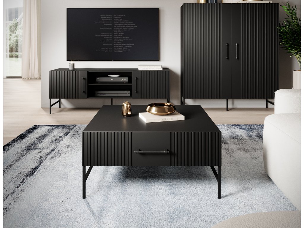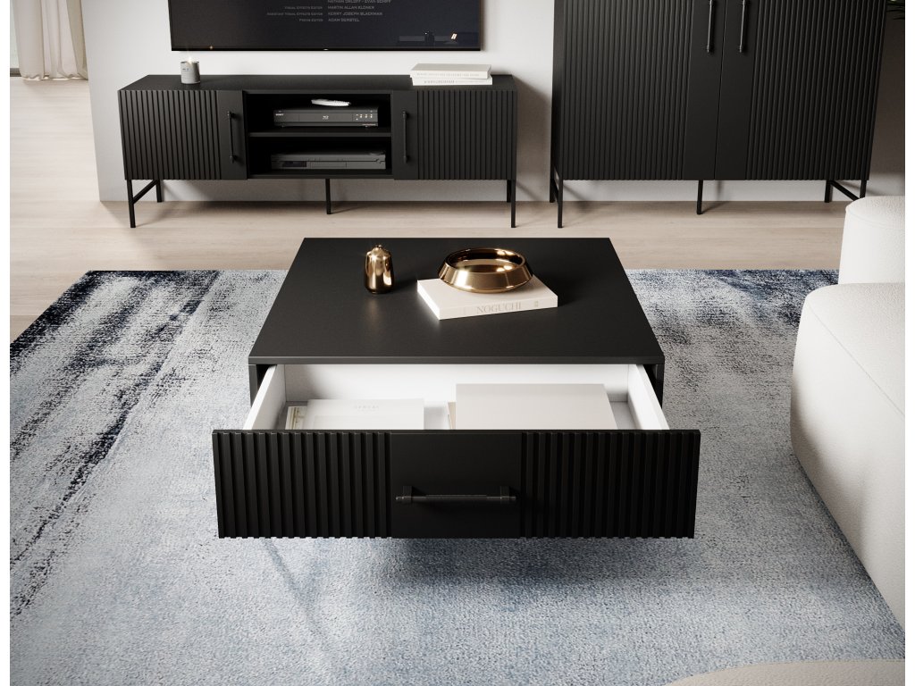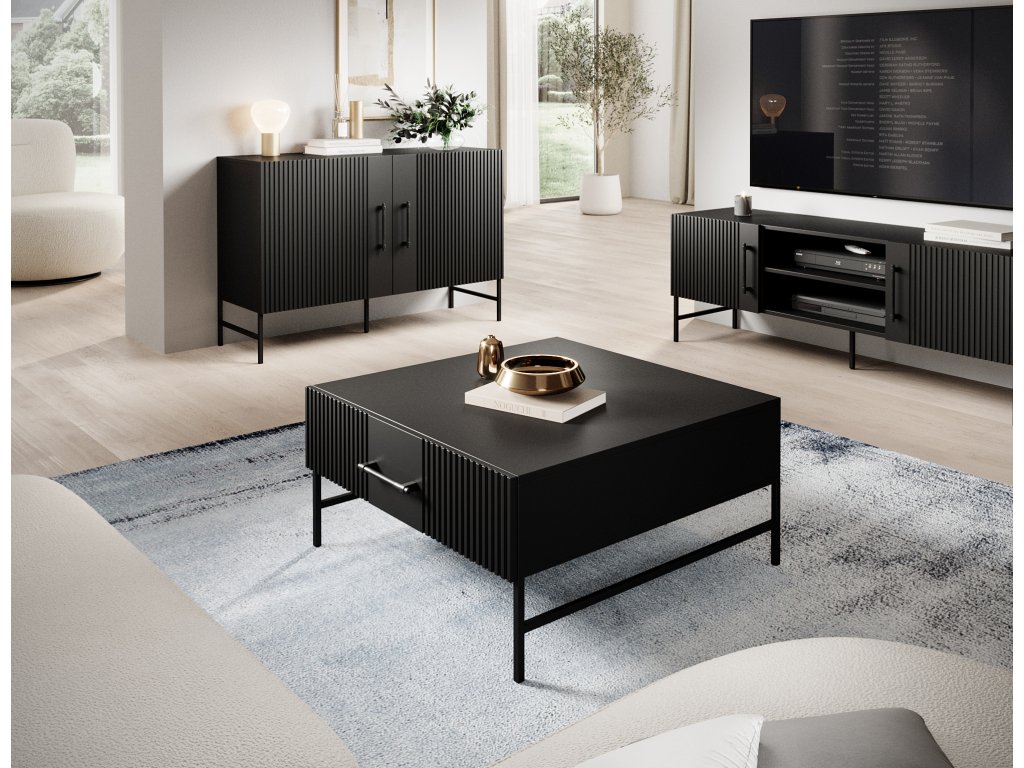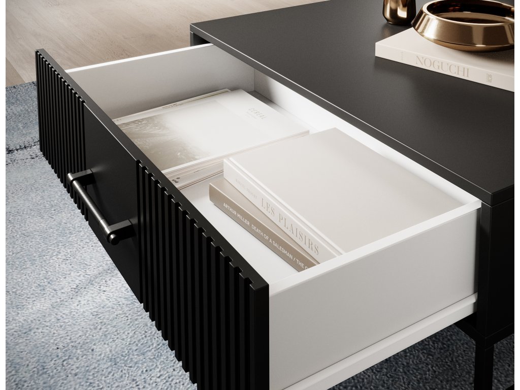 Konferenční stolek z kolekce Raftt spojuje minimalistickou formu a industriální styl, což z něj činí ideální volbu pro moderní interiéry. Jeho pevná konstrukce je vyrobena z laminované dřevotřískové desky a frézované čelní plochy z foliované MDF desky mu dodávají elegantní, surový charakter. Stabilitu a lehkost konstrukce zajišťují černé kovové nohy s práškovým nástřikem, které dokonale ladí s celkovým designem. Černé hliníkové úchytky zdůrazňují loftový styl nábytku a zásuvky na kolečkových pojezdech zajišťují plynulé a pohodlné používání. Díky svému univerzálnímu designu se stůl Raftt perfektně hodí do loftových, industriálních a moderních interiérů, přidávajíc jim estetiku i funkčnost.