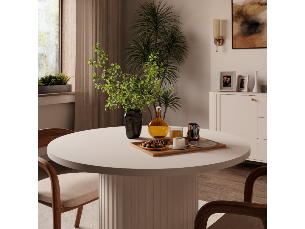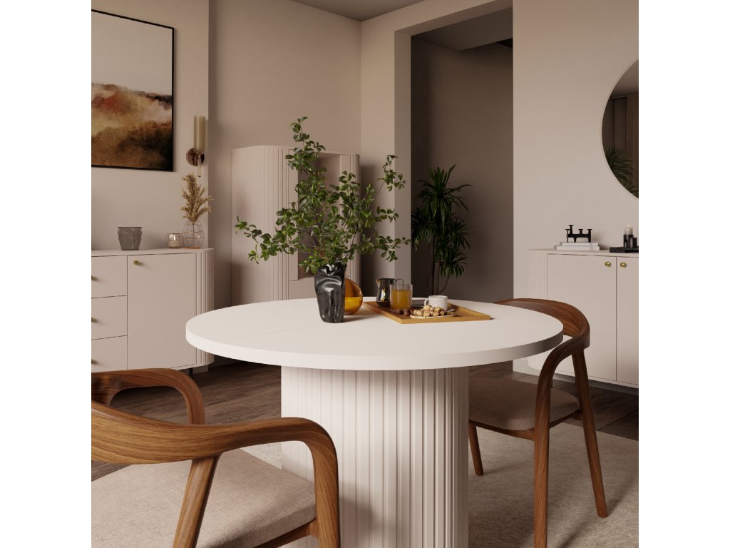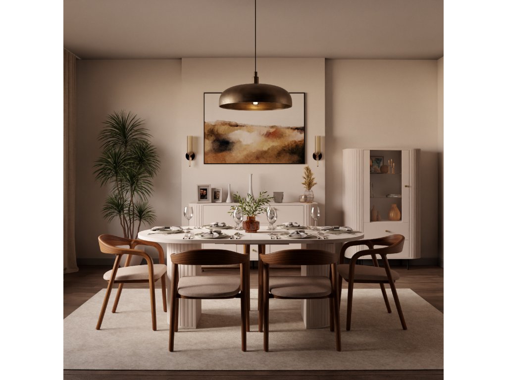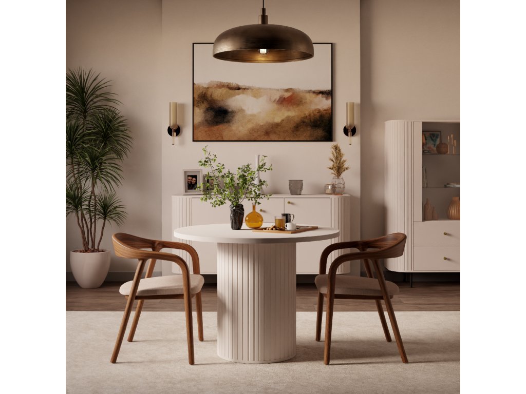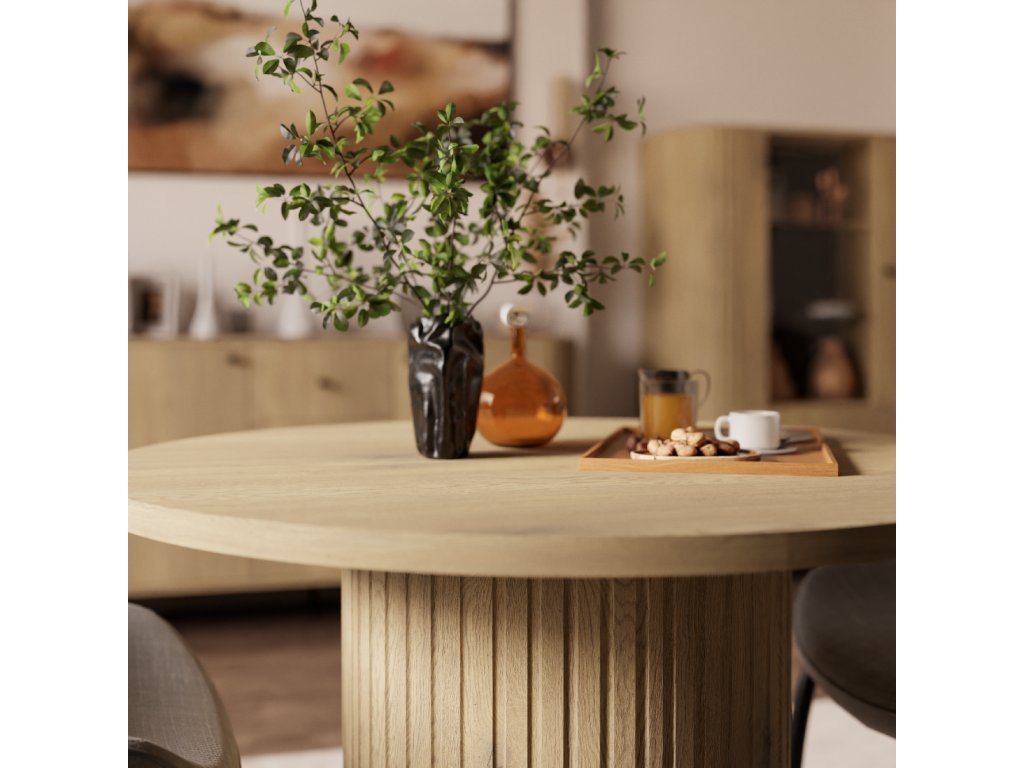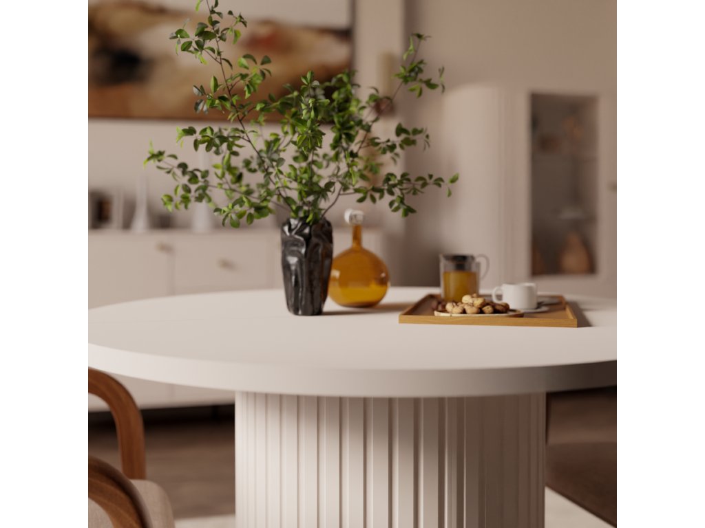 Díky svému jemně zaoblenému tvaru a výrazné centrální podnoži se stůl skvěle hodí do moderních i nadčasově laděných interiérů. Perfektně zapadne do minimalistických bytů, kde vynikne jeho čistá silueta, ale stejně dobře funguje i v teple laděném skandinávském prostoru plném přírodních materiálů.
