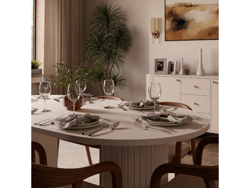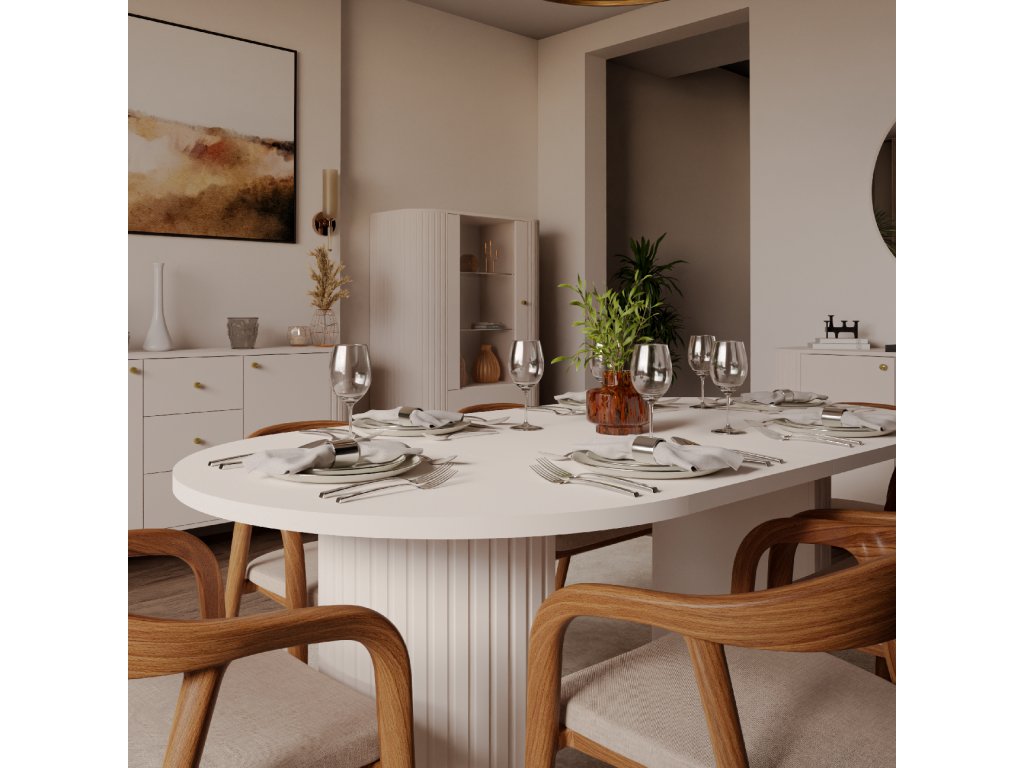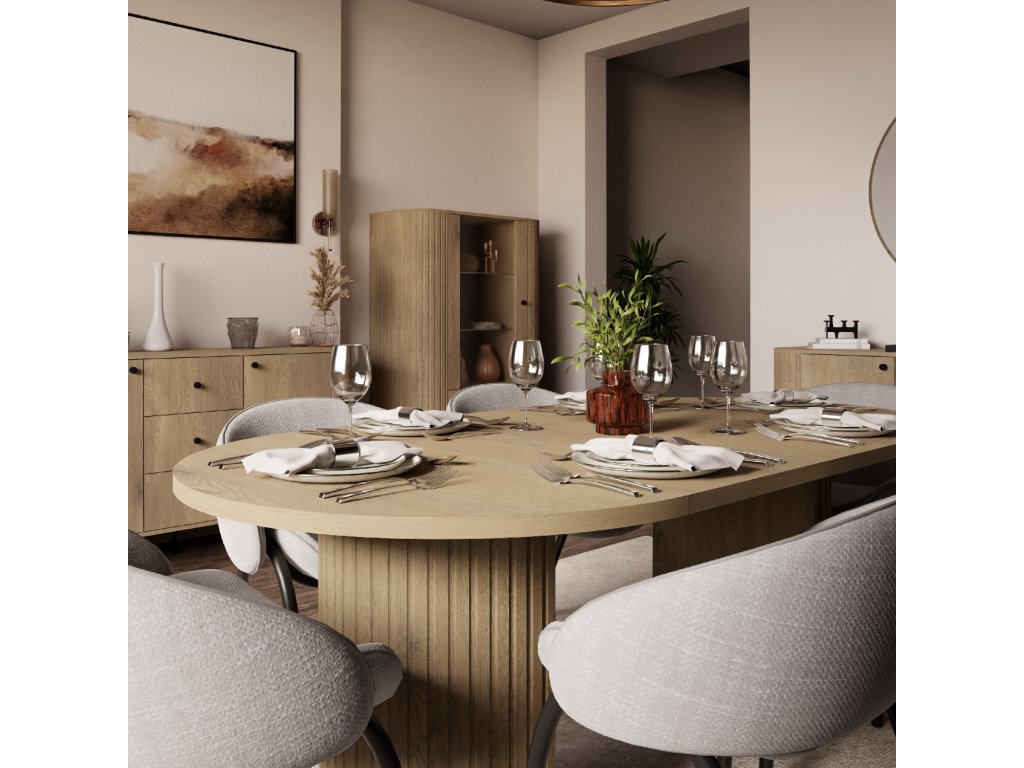 Oválný tvar zjemňuje prostor, podporuje příjemnou komunikaci u stolu a dodává celé místnosti vizuální lehkost.