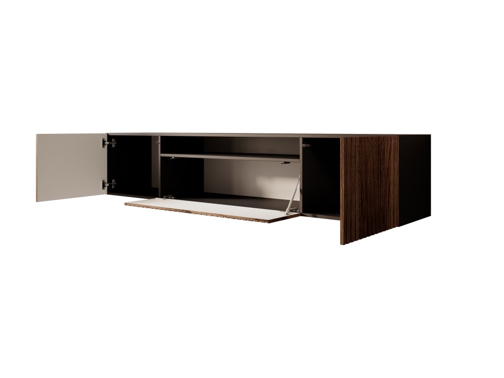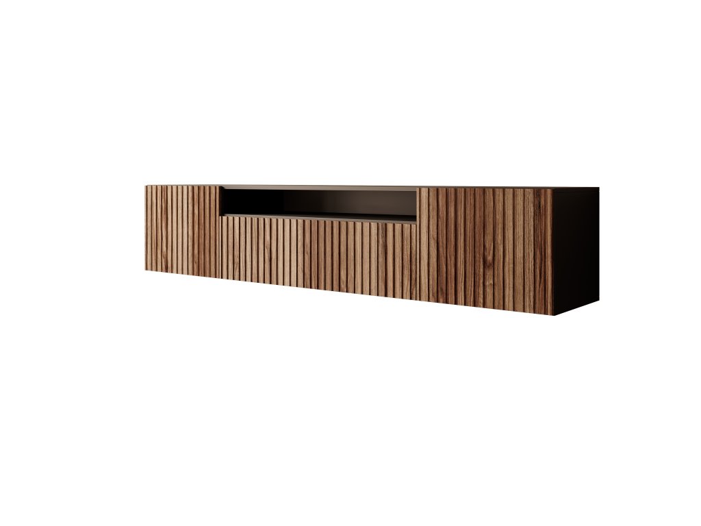 RTV skříňka Miro – moderní řešení pro váš obývací pokoj, které spojuje eleganci s funkčností. Model je dostupný ve dvou barevných variantách: klasické bílé s dekorem katania a stylové černé s dekorem katania, což umožňuje snadné sladění s různými interiérovými styly. RTV skříňka Miro je nabízena ve volně stojící i závěsné verzi, takže ji lze přizpůsobit vašemu prostoru a individuálním preferencím. Vysoce kvalitní materiály, včetně odolné laminované desky, zaručují nejen dlouhou životnost, ale také elegantní vzhled po mnoho let. Skříňka má prostorné police a praktické přihrádky, které pojmou veškerou RTV techniku a doplňky, čímž zajistí pořádek a snadný přístup k potřebným zařízením. RTV Miro je ideální volbou pro ty, kteří si cení stylu a pohodlí.