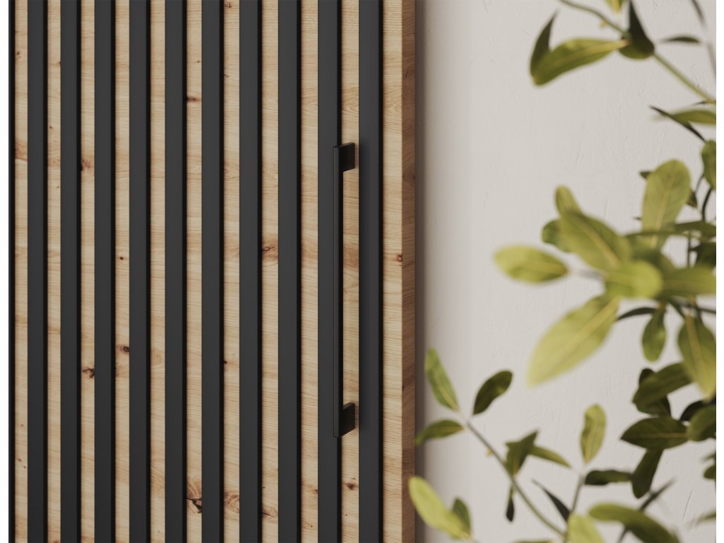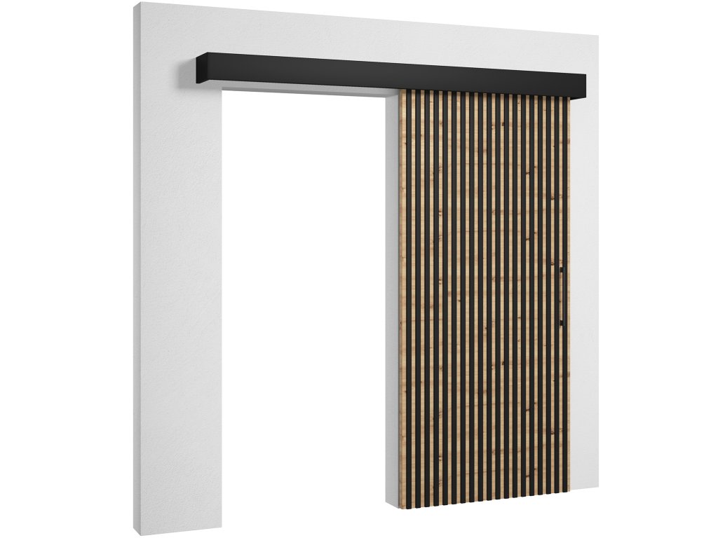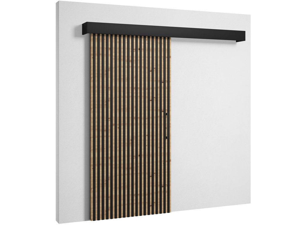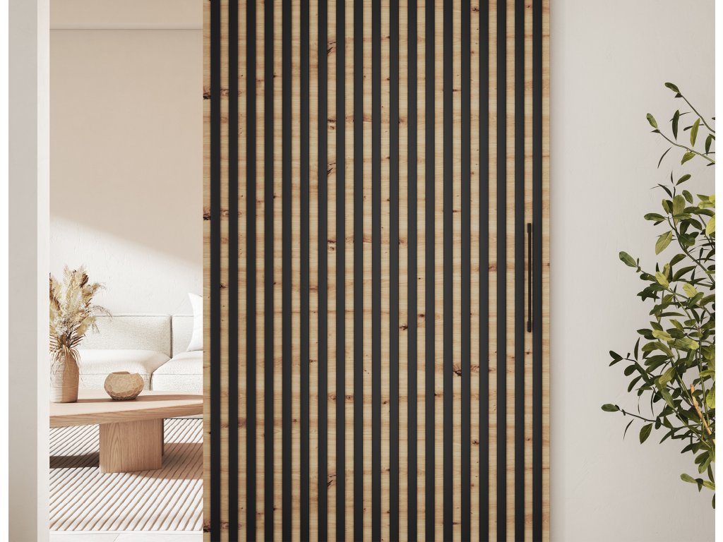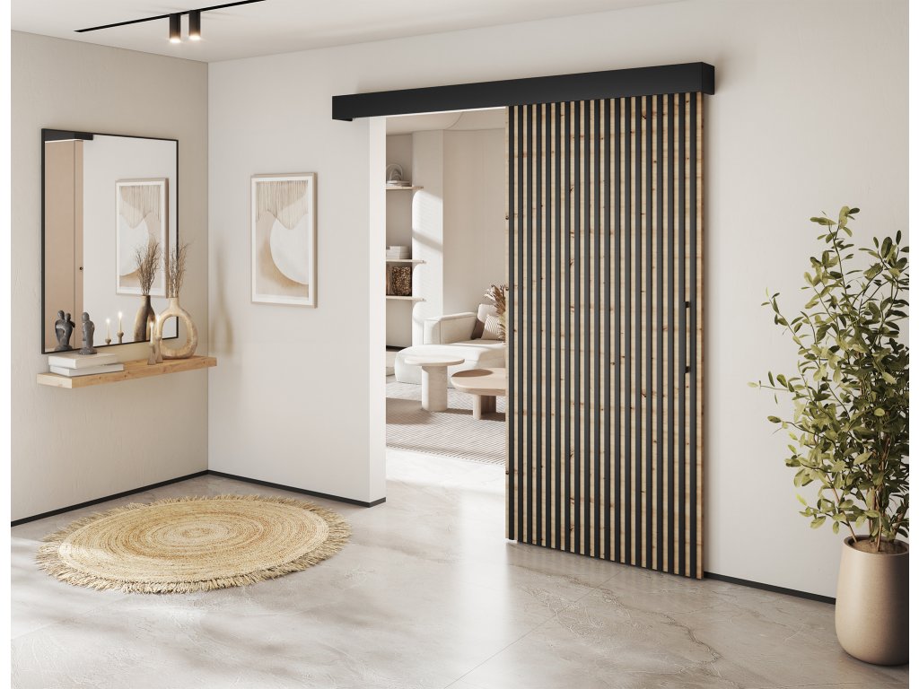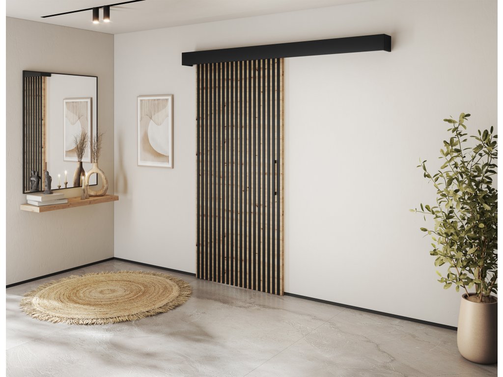 Posuvné dveře Tauricio o rozměrech 96 × 205 cm jsou moderním a funkčním řešením pro interiéry. Jsou vyrobeny z odolné dřevotřísky a plastu s elegantním matným černým povrchem, který se skvěle hodí k minimalistickému i industriálnímu stylu zařízení Systém All in One spojuje veškerou funkčnost do jedné konstrukce. Dveře jsou vybaveny hladce fungující pojezdovou kolejnicí, která zajišťuje tichý a pohodlný provoz, a také pevným hliníkovým madlem s kartáčovanou povrchovou úpravou, které podtrhuje moderní charakter dveří. Jsou ideální jako přepážka mezi místnostmi, dveře do šatny, spíže nebo kanceláře a umožňují optimální využití prostoru. Součástí balení nejsou hmoždinky pro montáž do stěny – jejich výběr je třeba přizpůsobit konkrétnímu typu podkladu, aby byla zajištěna stabilní a bezpečná instalace. Posuvné dveře Tauricio jsou stylovou a praktickou volbou pro náročné uživatele, kteří si potrpí na estetiku a odolnost.Doplňkové parametry