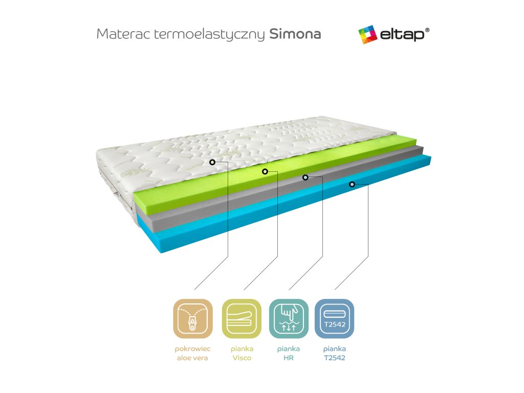Matrace Simona je výrobek z těch nejkvalitnějších materiálů, ideální pro ty, kteří si zakládají na dokonalé kvalitě spánku. Díky použití tří typů pěn je matrace mimořádně pohodlná. Vysoce elastická pěna HR je z jedné strany obklopena měkkou visco pěnou, která se přizpůsobuje tvaru těla, a z druhé strany pěnou T2542, která dodává konstrukci stabilitu a podporu. Termoelastická matrace Simona je navíc vybavena snímatelným potahem Silk, který je příjemný na dotek a snadno se udržuje.Doplňkové parametry