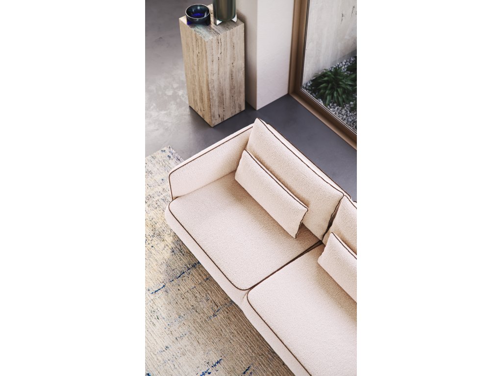 - Okraje sedáků a polštářů jsou zpevněny lemem (kedrou) z kvalitní veganské kůže. Tento prvek není jen estetickým doplňkem, ale slouží i jako funkční ochrana nejvíce namáhaných hran. Veganská kůže je odolná vůči otěru a snadno se udržuje, což zaručuje, že si pohovka zachová své precizní linie i při každodenním rodinném provozu.
