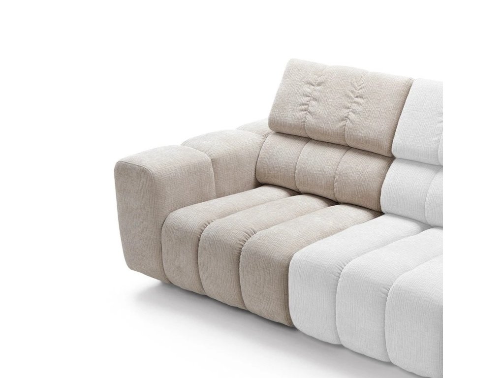 - Dominantou této sedačky je hluboké vertikální prošívání, které člení její povrch do pravidelných, bohatě polstrovaných segmentů. Tento lineární rytmus dodává sedací soupravě jasný řád a architektonickou čistotu, přičemž vizuálně zdůrazňuje její velkorysé proporce a mimořádnou měkkost.