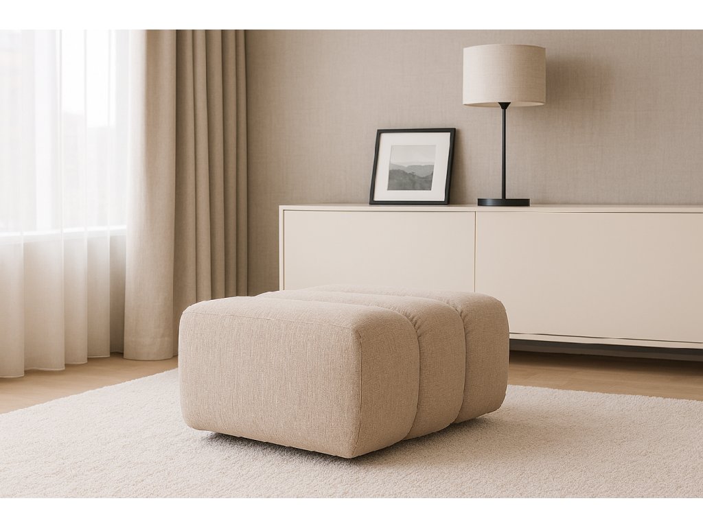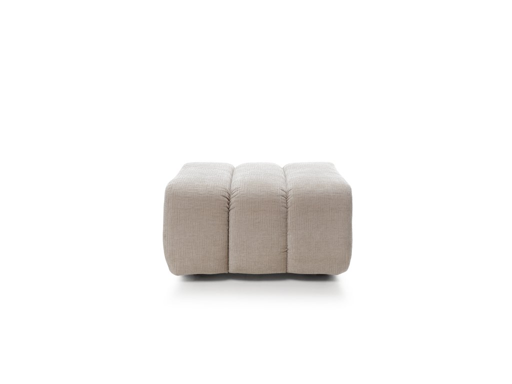 - Dominantou je hluboké vertikální prošívání, které člení jeho povrch do pravidelných, bohatě polstrovaných segmentů. Tento lineární rytmus dodává taburetu jasný řád a architektonickou čistotu, přičemž vizuálně zdůrazňuje jeho velkorysé proporce a mimořádnou měkkost.